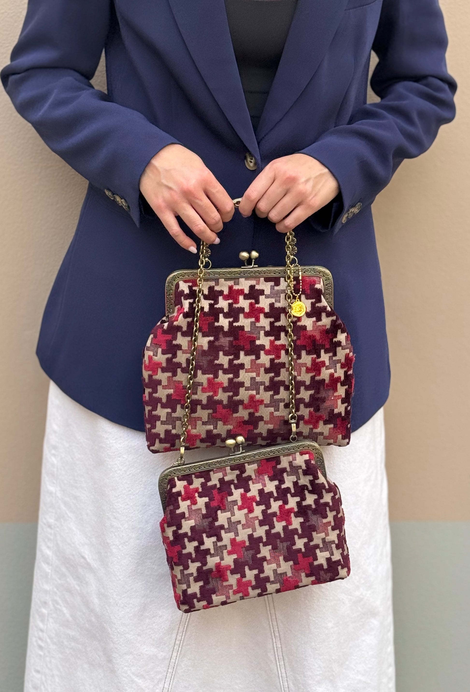Our Andreina Puzzle is made of velvet fabric, has a 20cm bronze clasp and a 60cm removable chain. It is lined in satin inside.