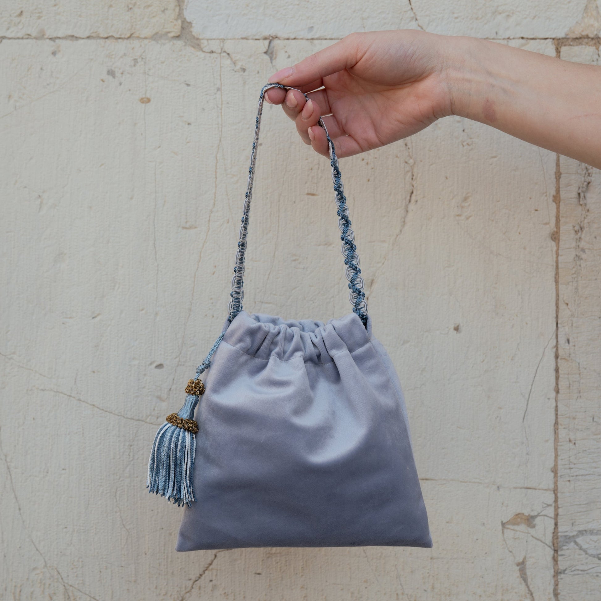 La nostra mini borsa Lulù Azzurro polvere è realizzata in velluto d'arredo e foderata internamente in raso.
