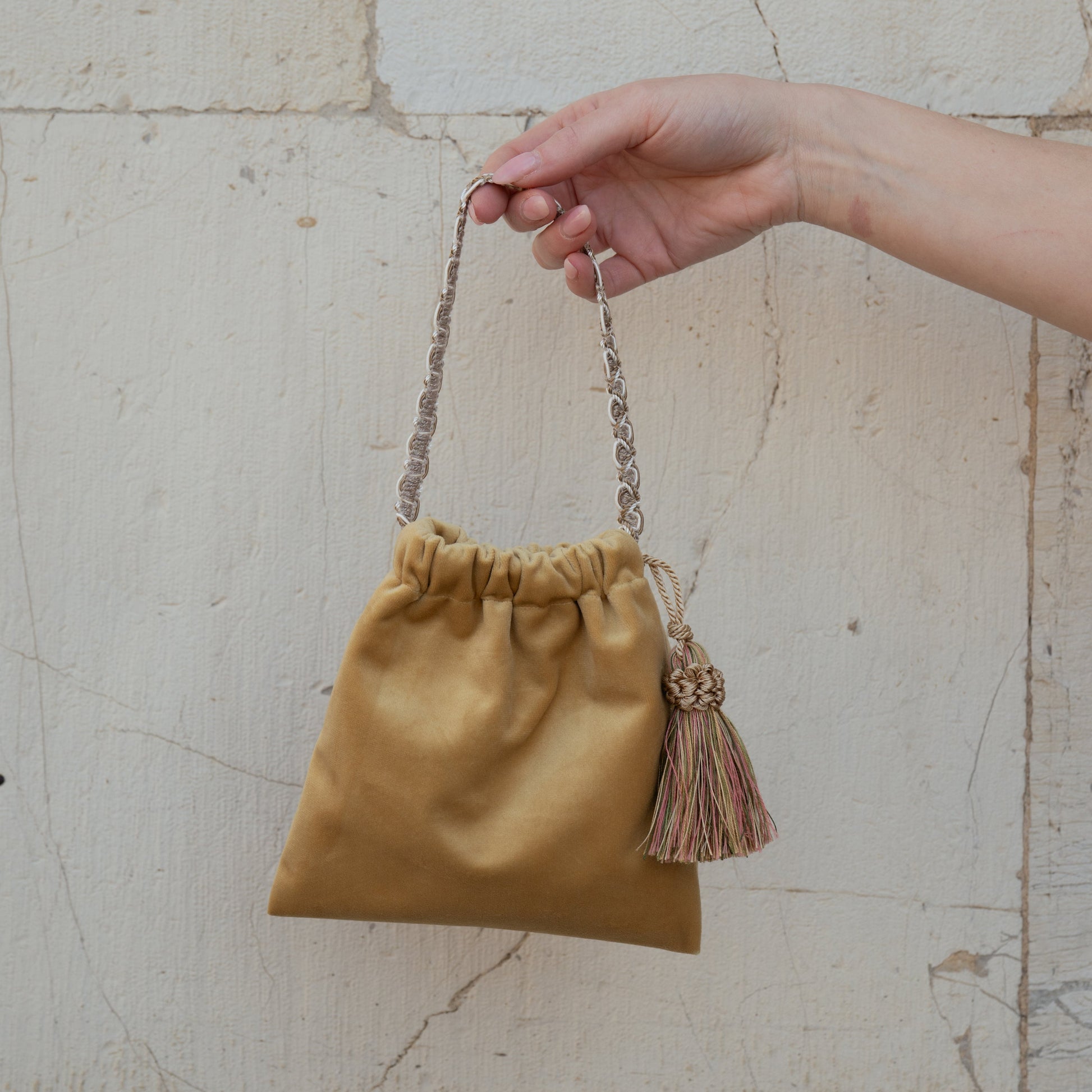La nostra mini borsa Lulù Giallo è realizzata in velluto d'arredo e foderata internamente in raso.