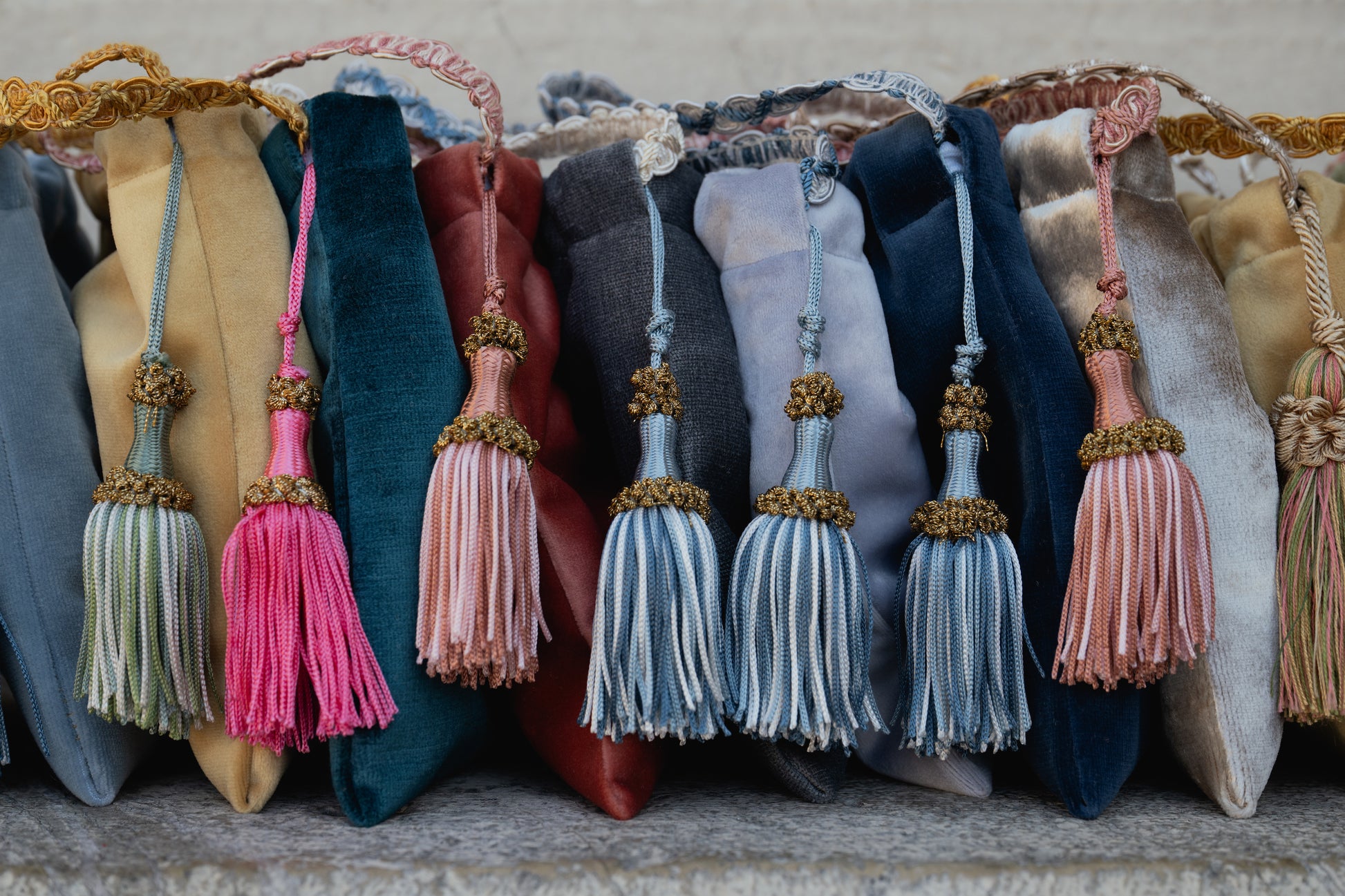 La nostra mini borsa Lulù Hazelnut è realizzata in velluto d'arredo e foderata internamente in raso.