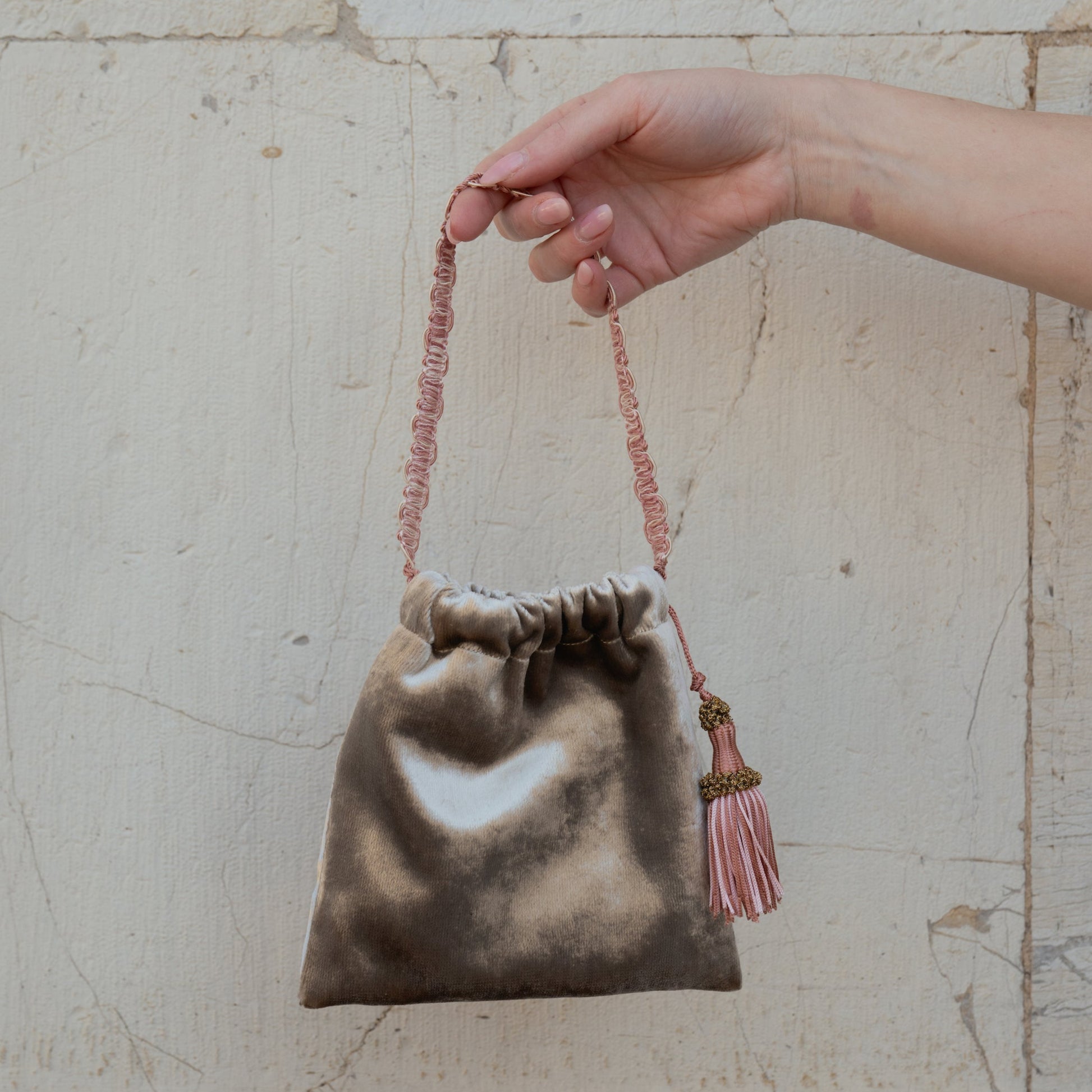 La nostra mini borsa Lulù Greige - Rosa cipria è realizzata in velluto d'arredo e foderata internamente in raso.