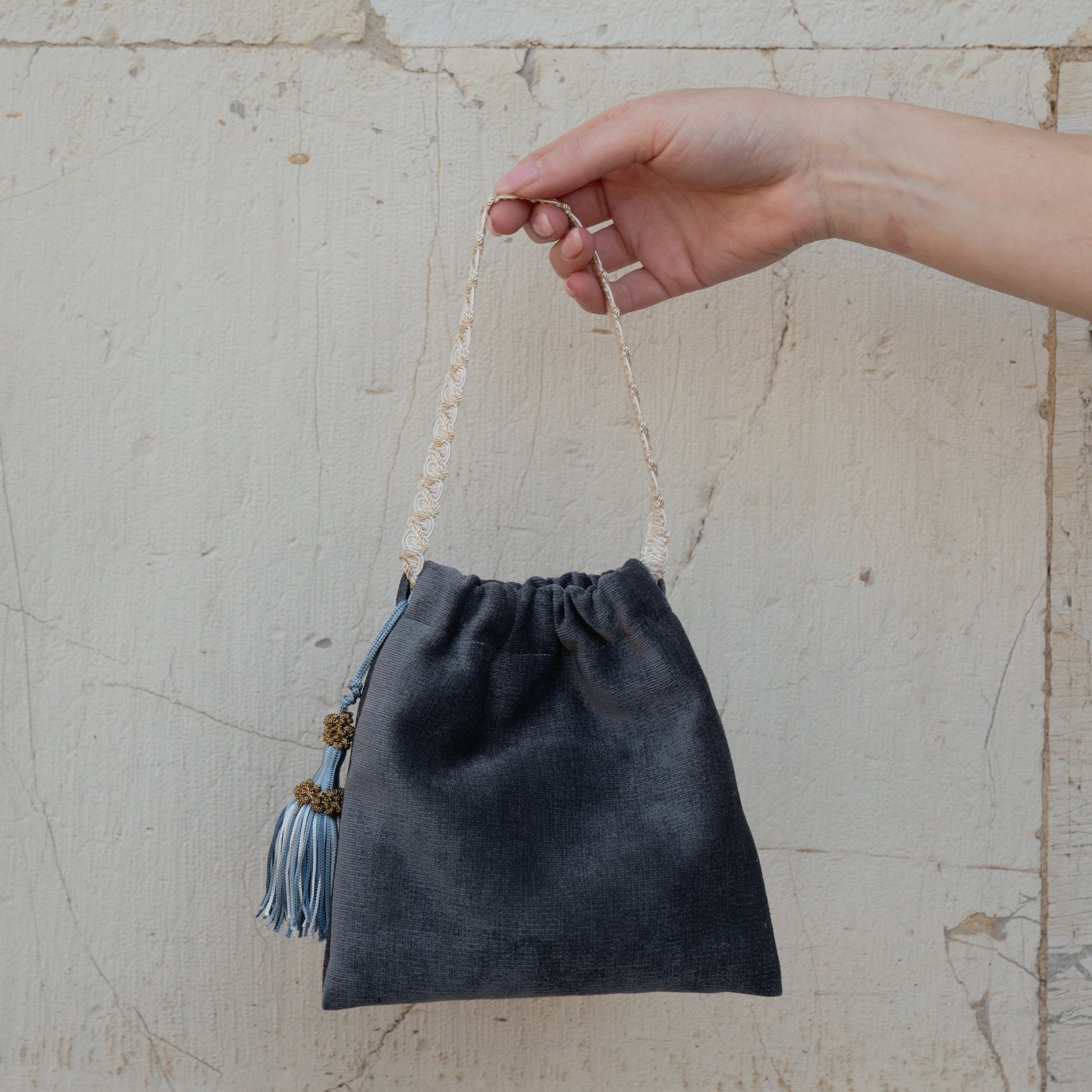 La nostra mini borsa Lulù Grigio pietra è realizzata in velluto d'arredo e foderata internamente in raso.
