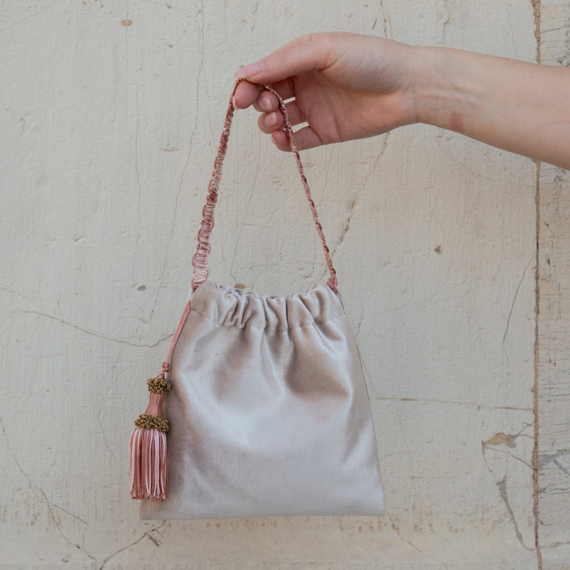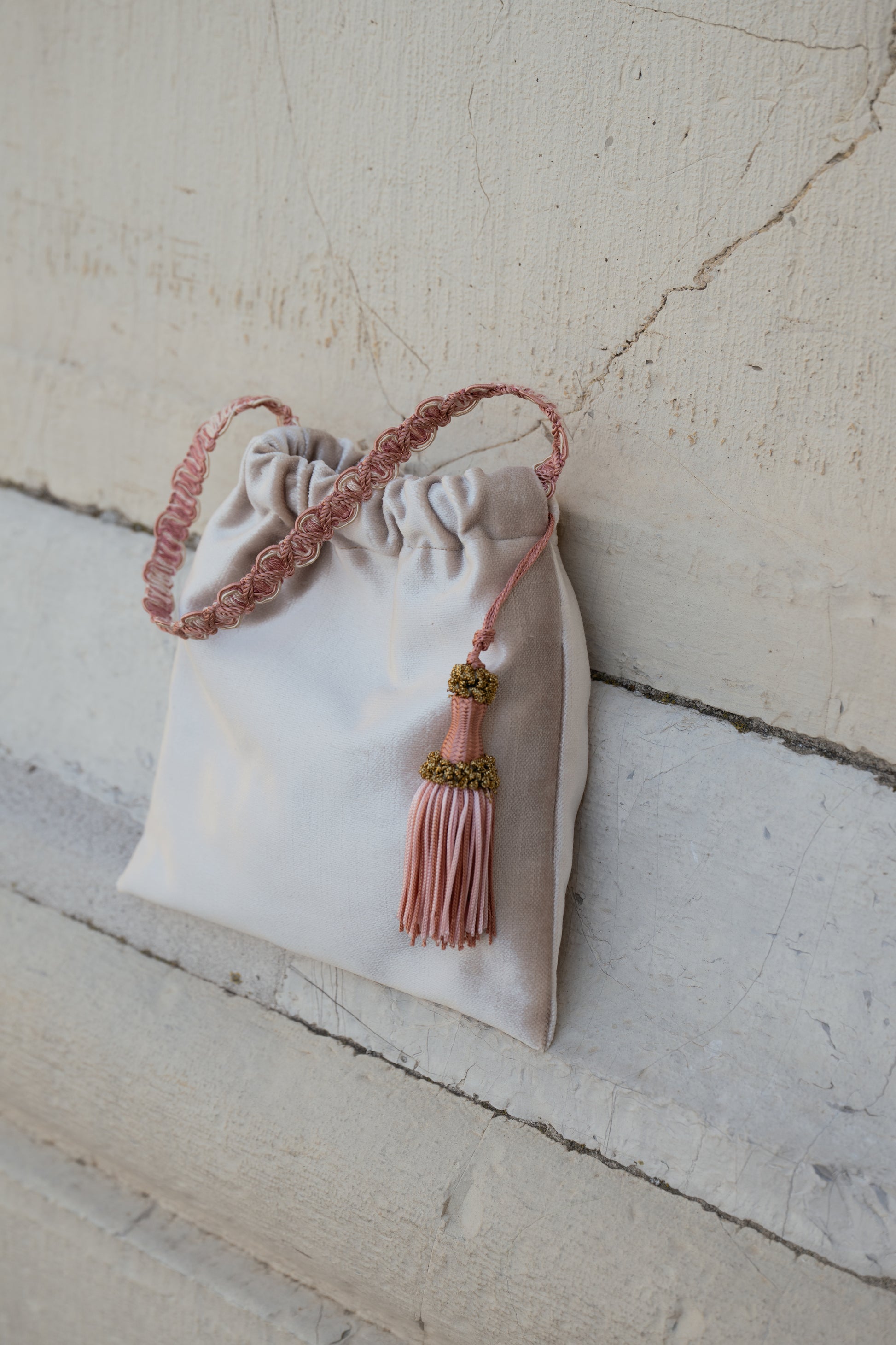 La nostra mini borsa Lulù Latte - Rosa cipria è realizzata in velluto d'arredo e foderata internamente in raso.