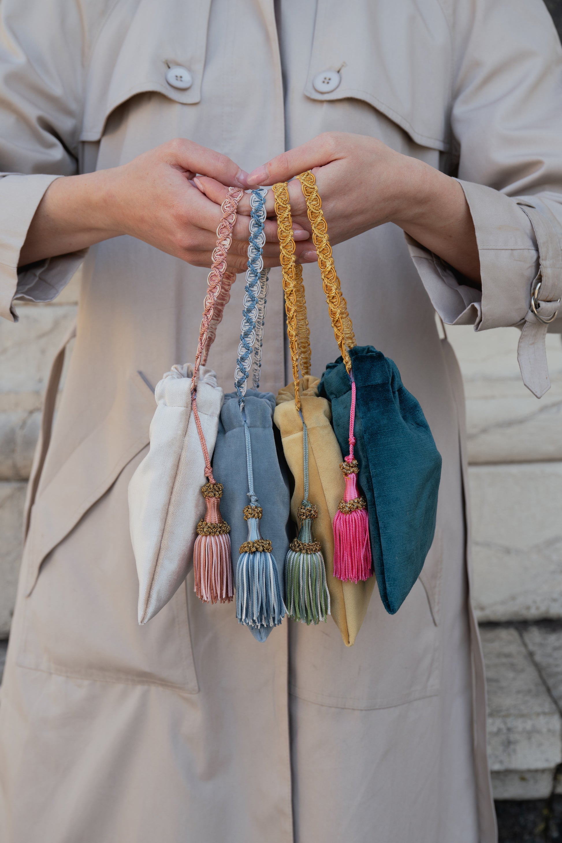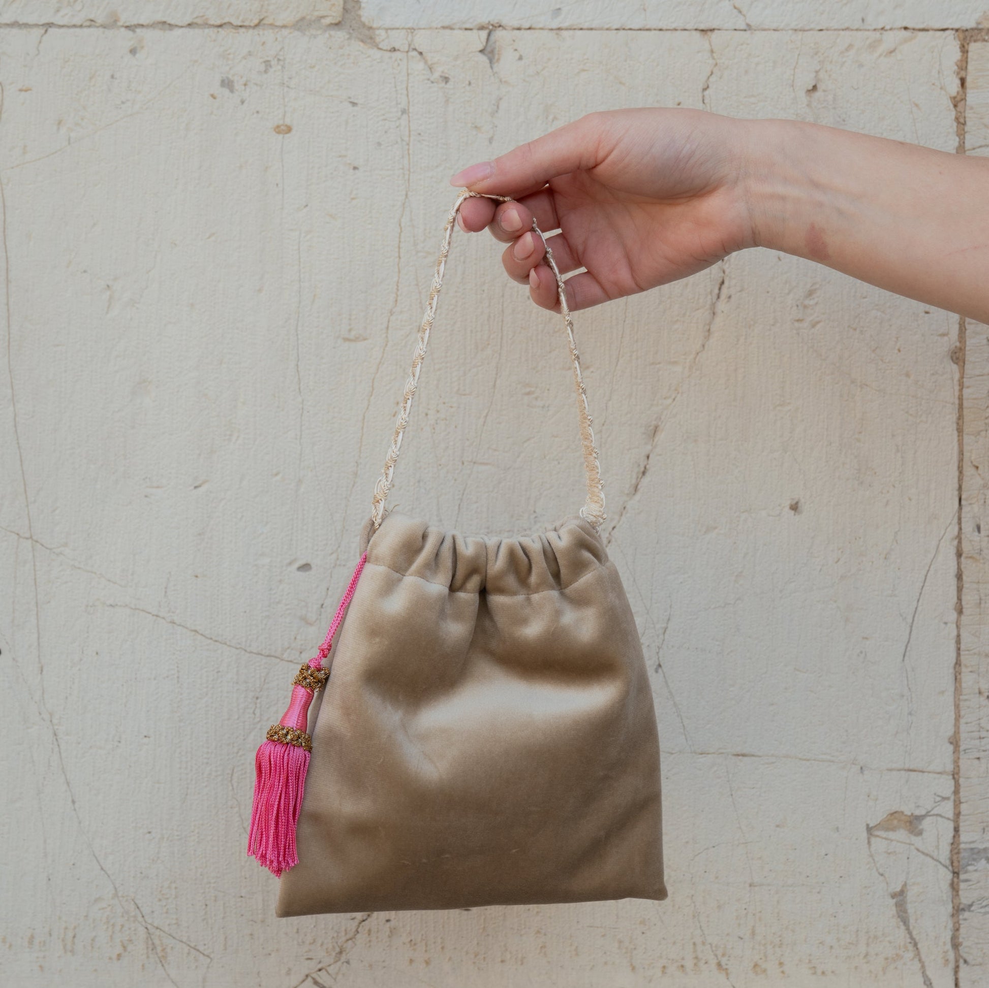 La nostra mini borsa Lulù Sabbia - Fucsia è realizzata in velluto d'arredo e foderata internamente in raso.