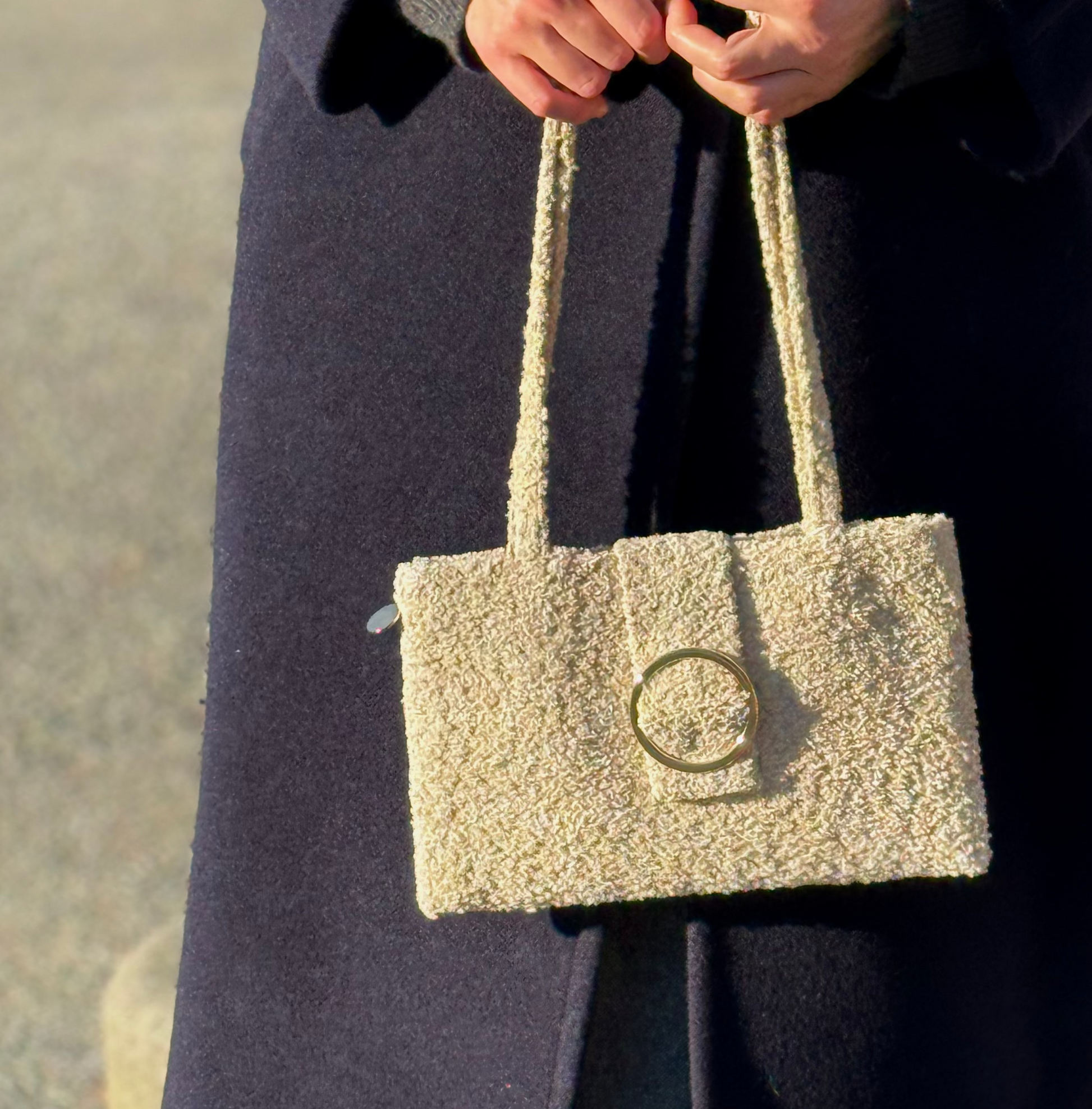 Realizzata esternamente in bouclé beige, questa borsa è impreziosita da una fibbia dorata che aggiunge un tocco elegante e raffinato, Internamente è rivestita in raso e si chiude con un pratico bottone magnetico.