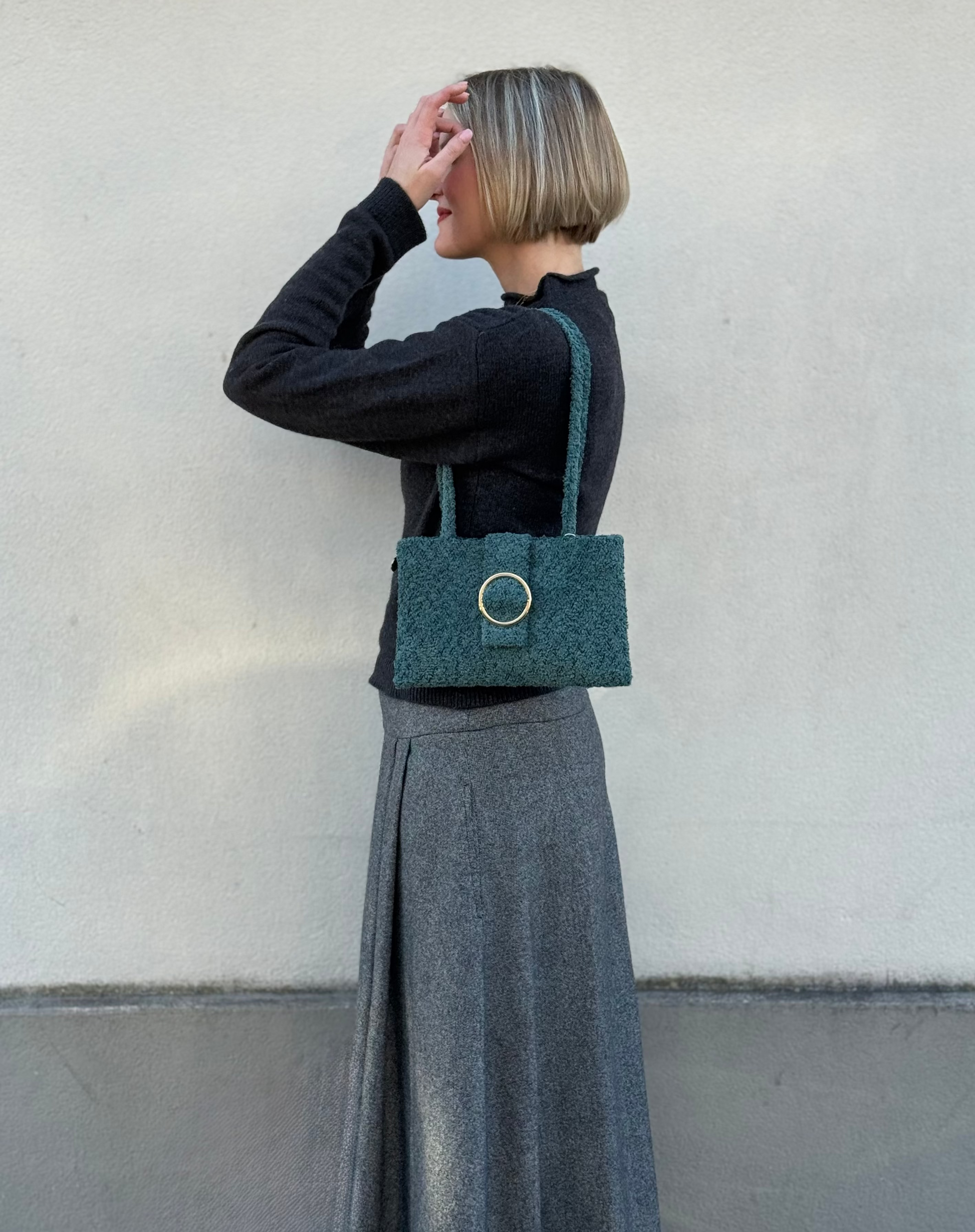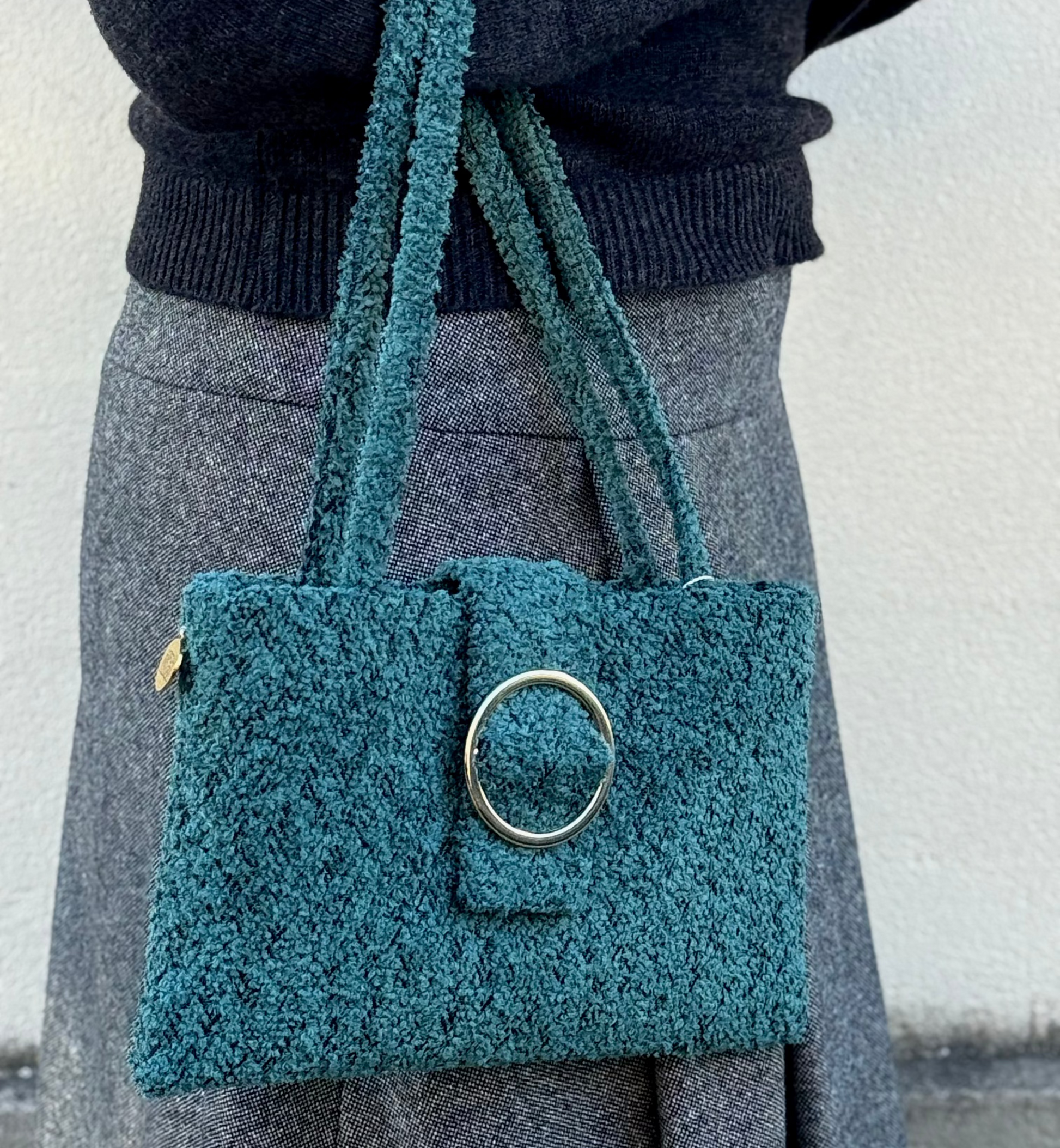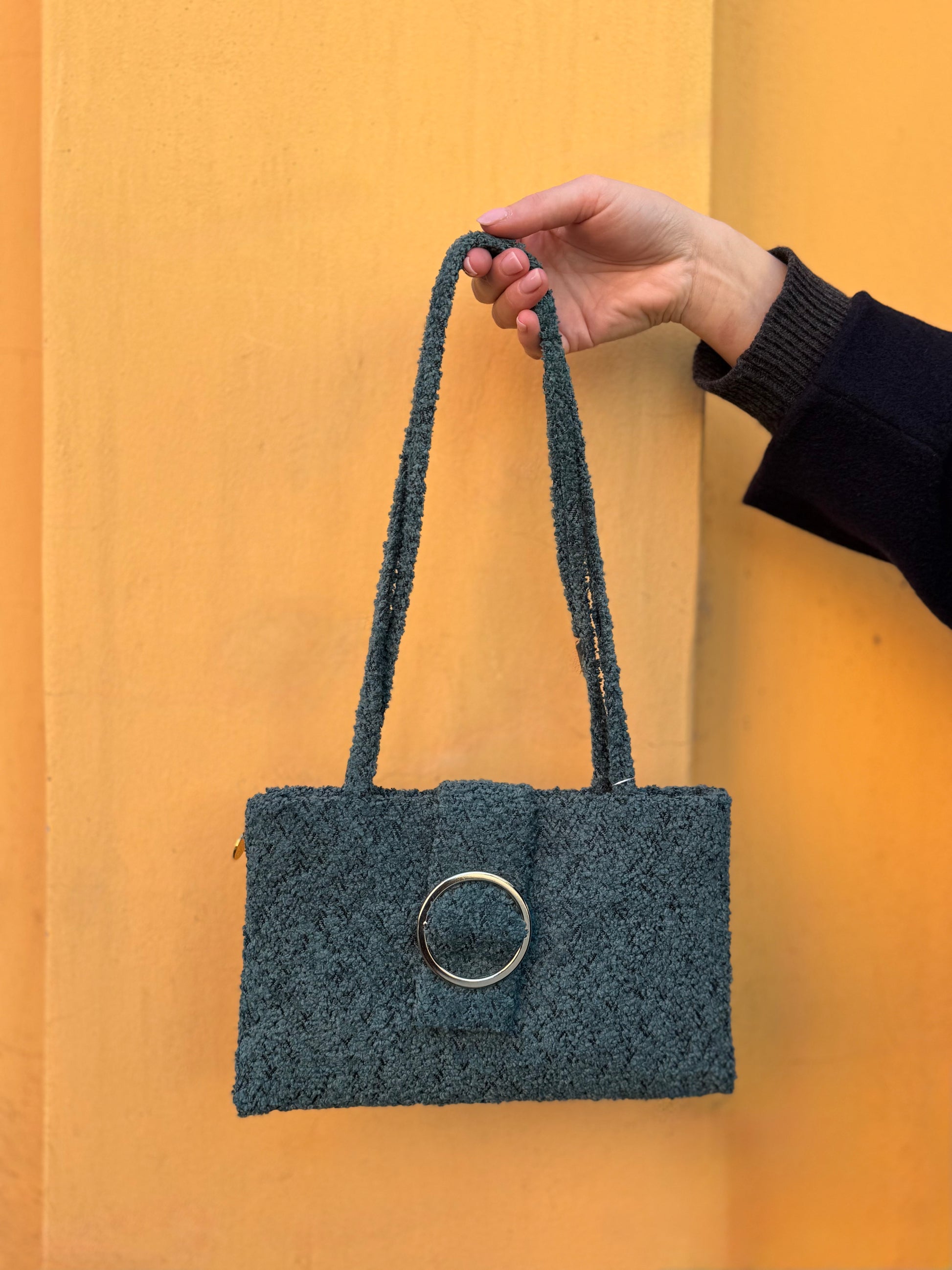 Realizzata esternamente in bouclé petrolio, questa borsa è impreziosita da una fibbia dorata che aggiunge un tocco elegante e raffinato, Internamente è rivestita in raso e si chiude con un pratico bottone magnetico.