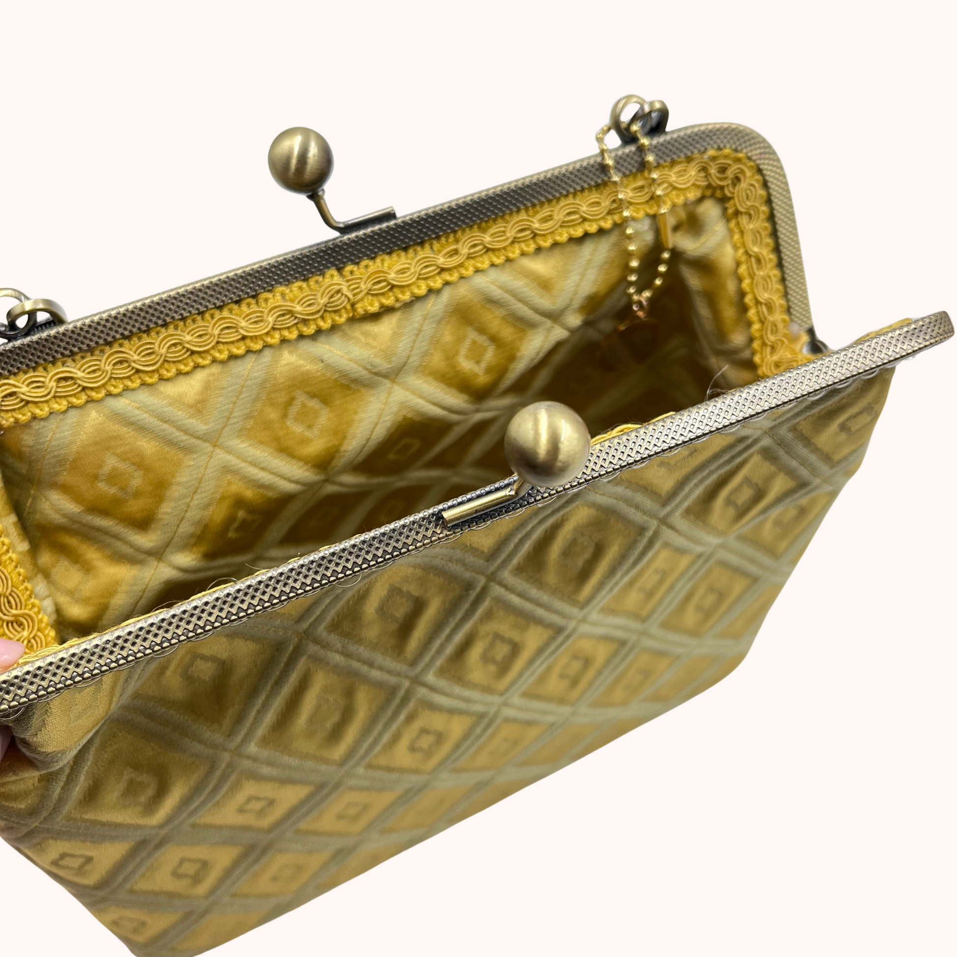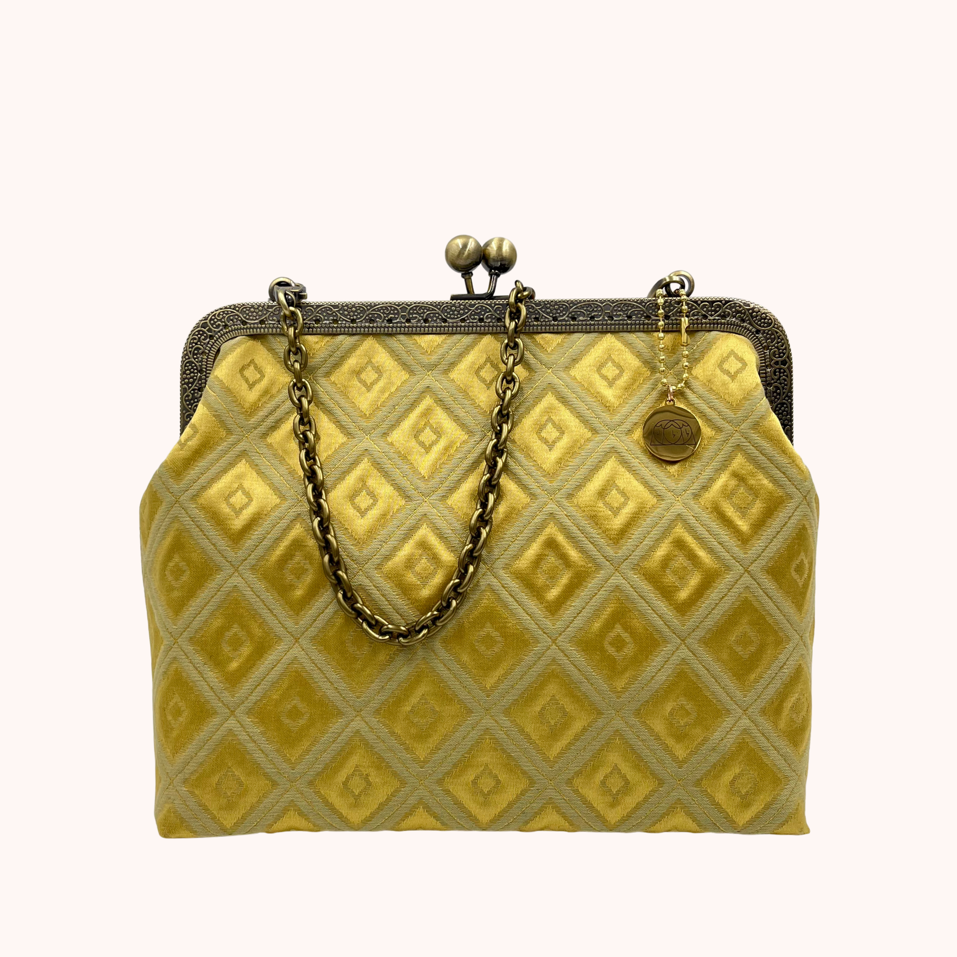 La nostra ANDREINA Rombi Lime è realizzata in tessuto d'arredo, ha una chiusura colore bronzo di 20cm e una catena rimovibile di 60cm. Al suo interno è foderata in raso.
