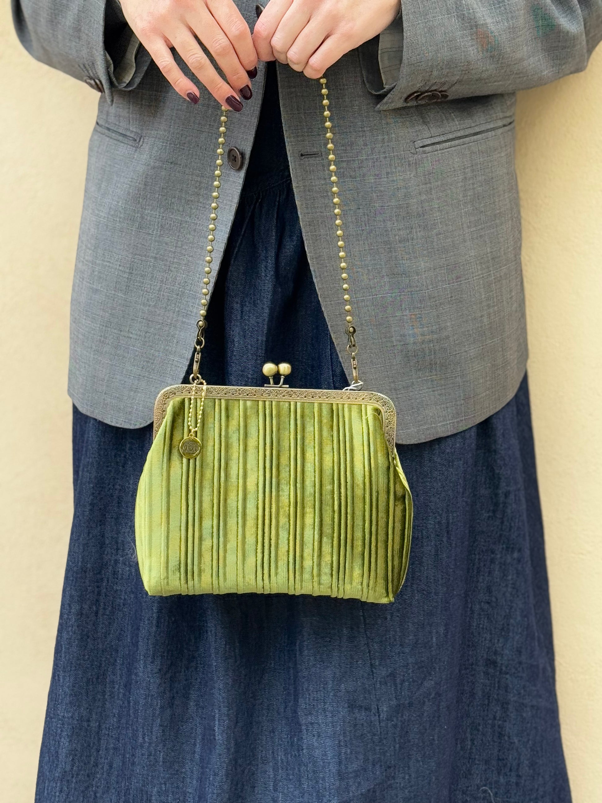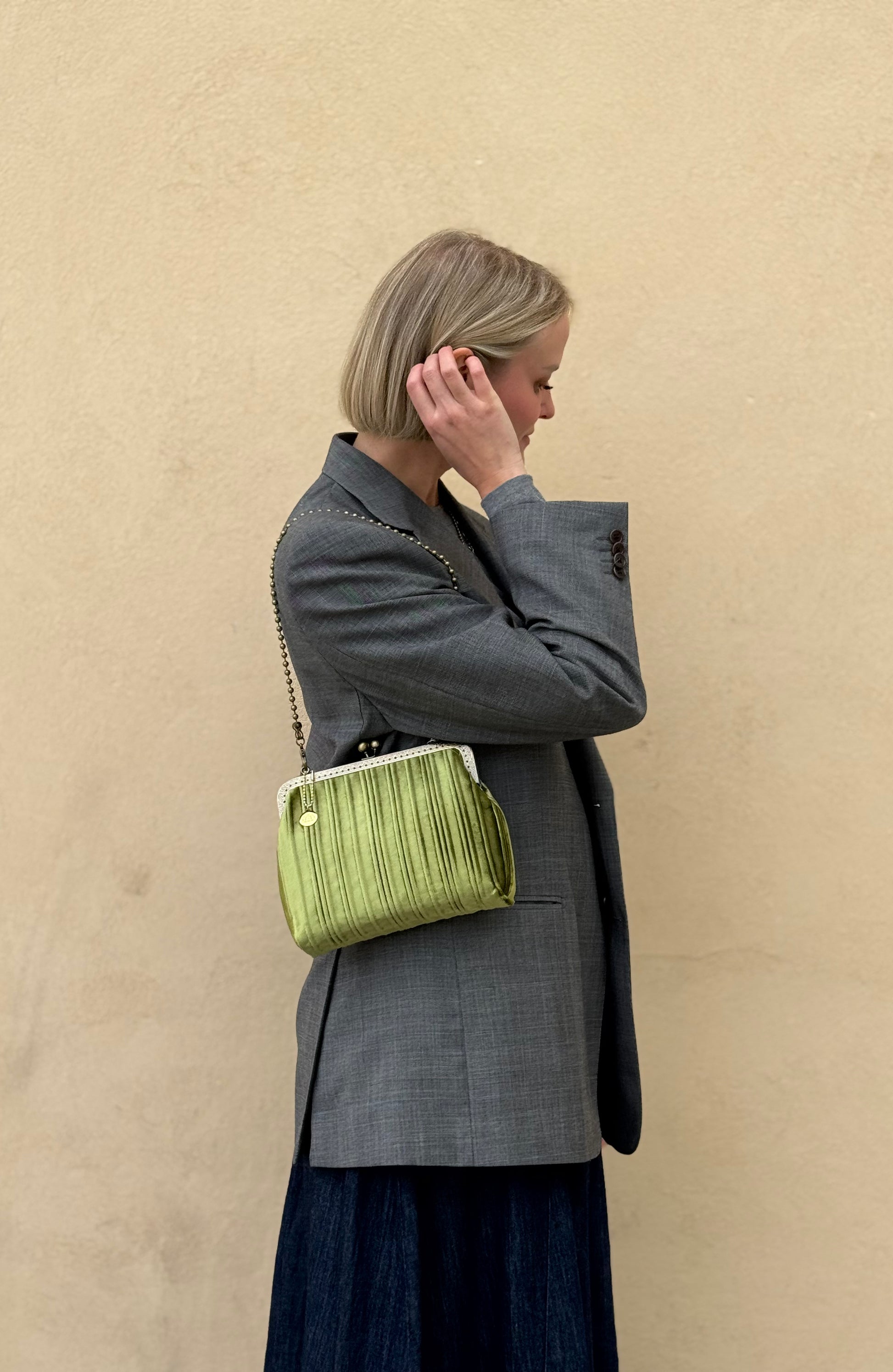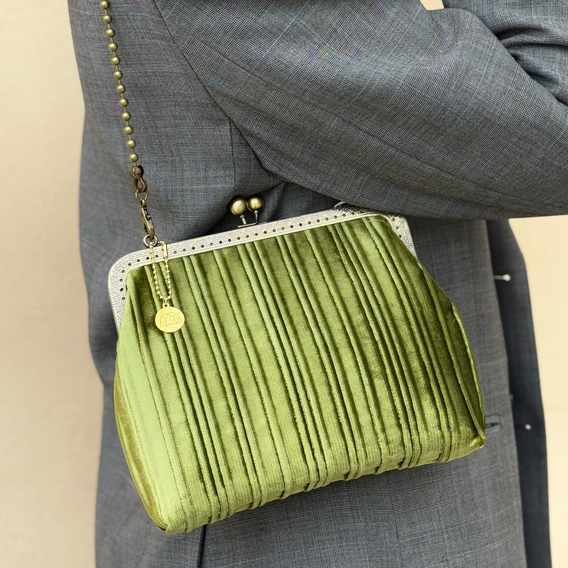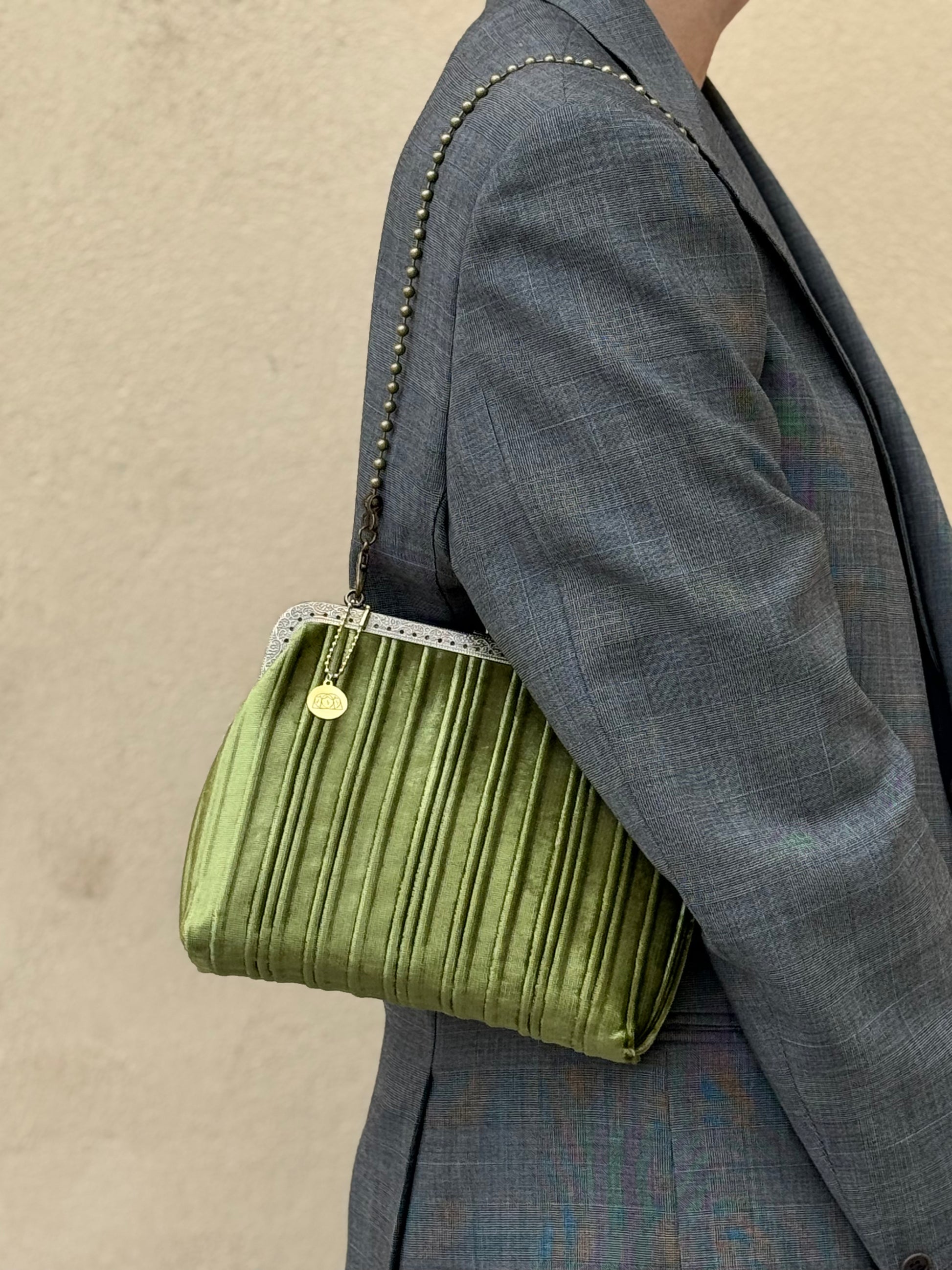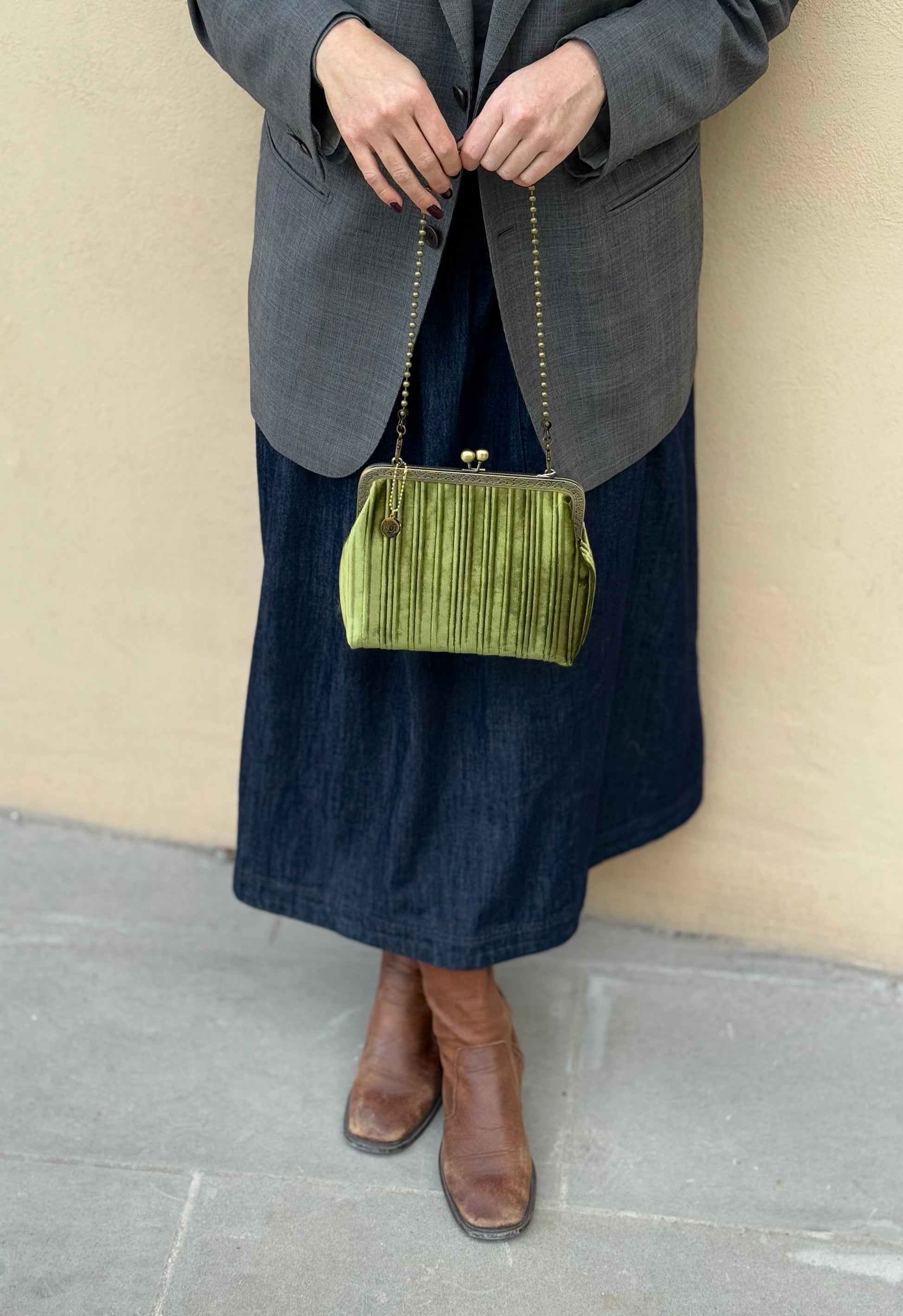 La nostra ANDREINA Sipario Green è realizzata in velluto d'arredo, ha una chiusura colore bronzo di 20cm e una catena rimovibile di 60cm. Al suo interno è foderata in seta.