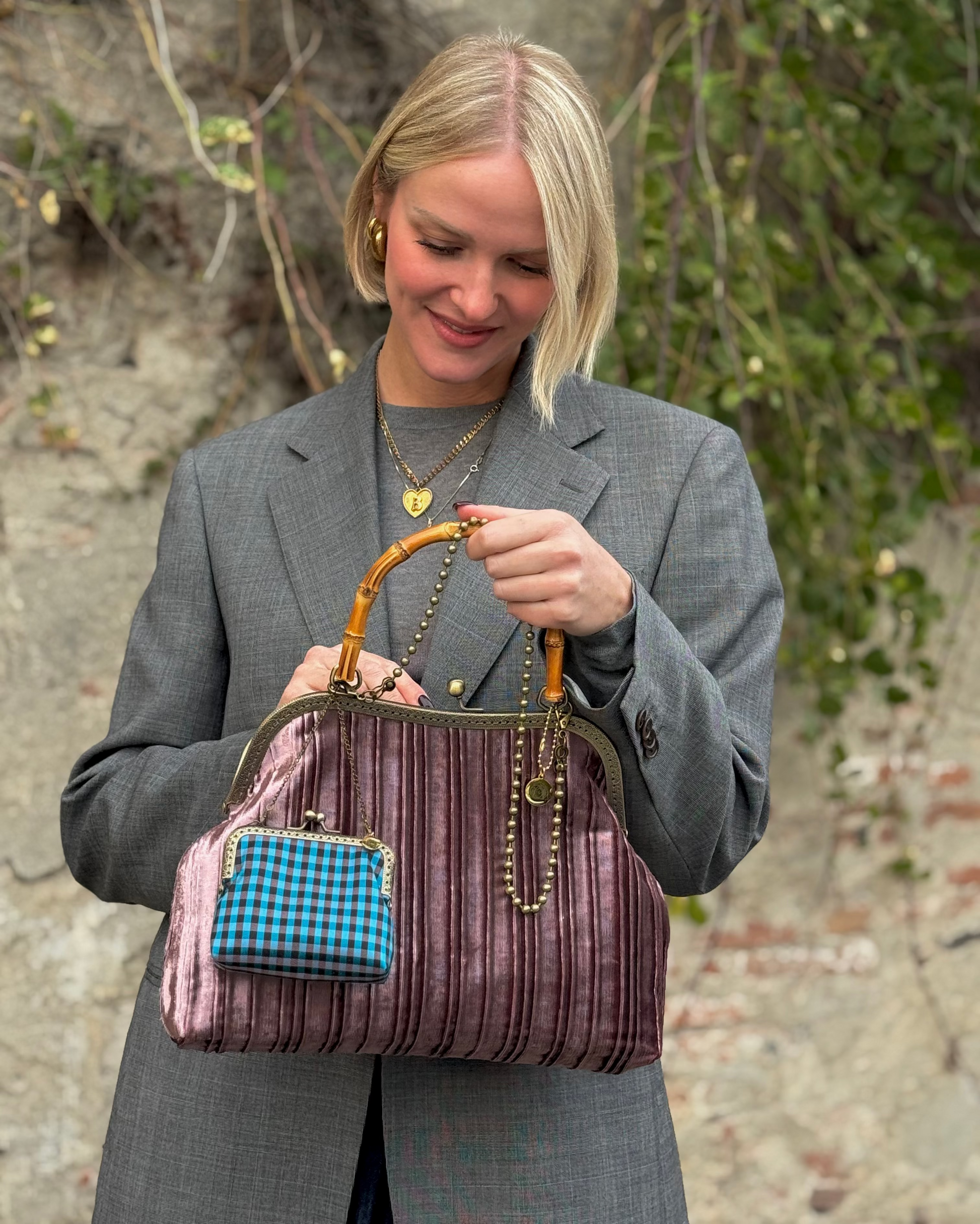La nostra COSTANZA Sipario Mauve è realizzata in velluto d'arredo, ha una chiusura colore bronzo di 30cm con un manico in bambù, una catena di 60 cm per portarla a spalla ed è venduta insieme al borsellino coordinato, dotato di catenella rimovibile. Al suo interno è foderata in seta e presenta una comoda tasca.