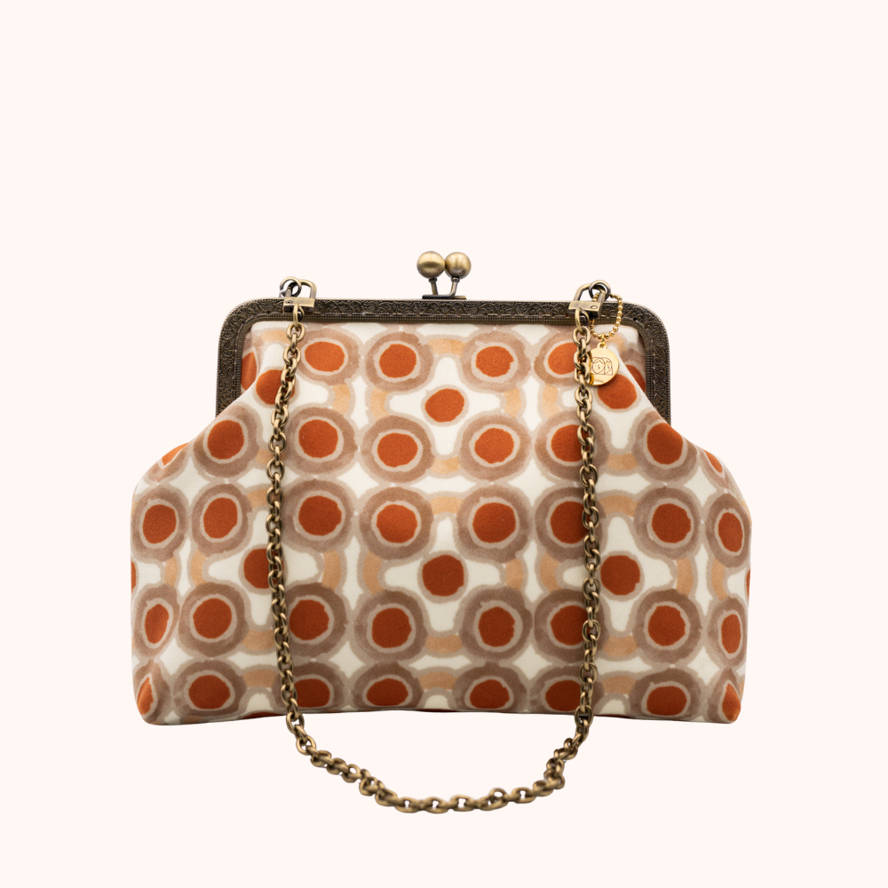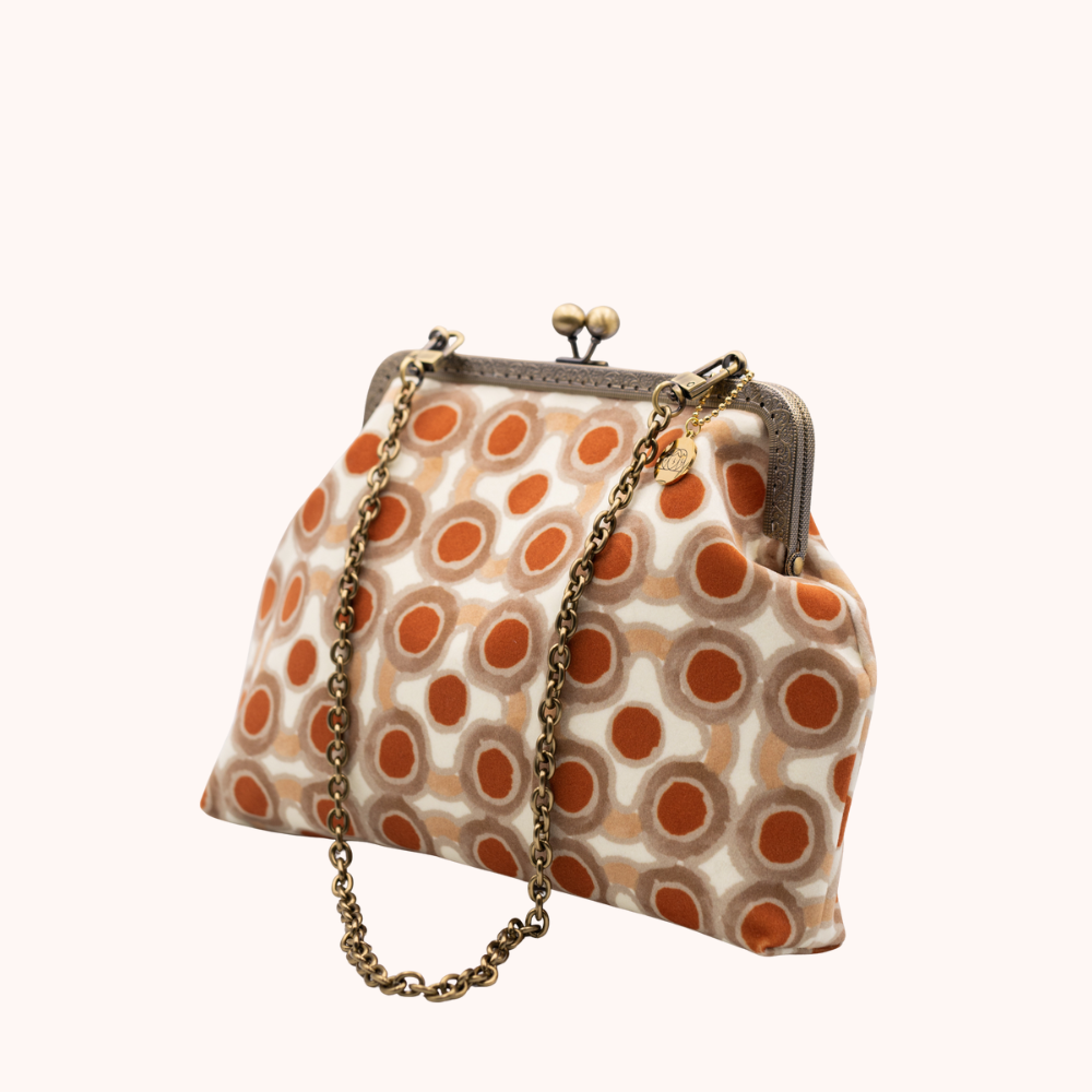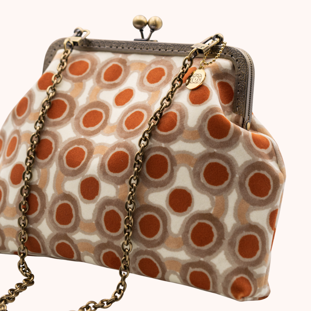 La nostra Glenda Albicocche è realizzata esternamente in velluto stampato, ha una chiusura colore bronzo di 20cm e una catena rimovibile per portarla a spalla che misura 60cm. Al suo interno è foderata in raso e presenta una tasca, anch'essa in raso.