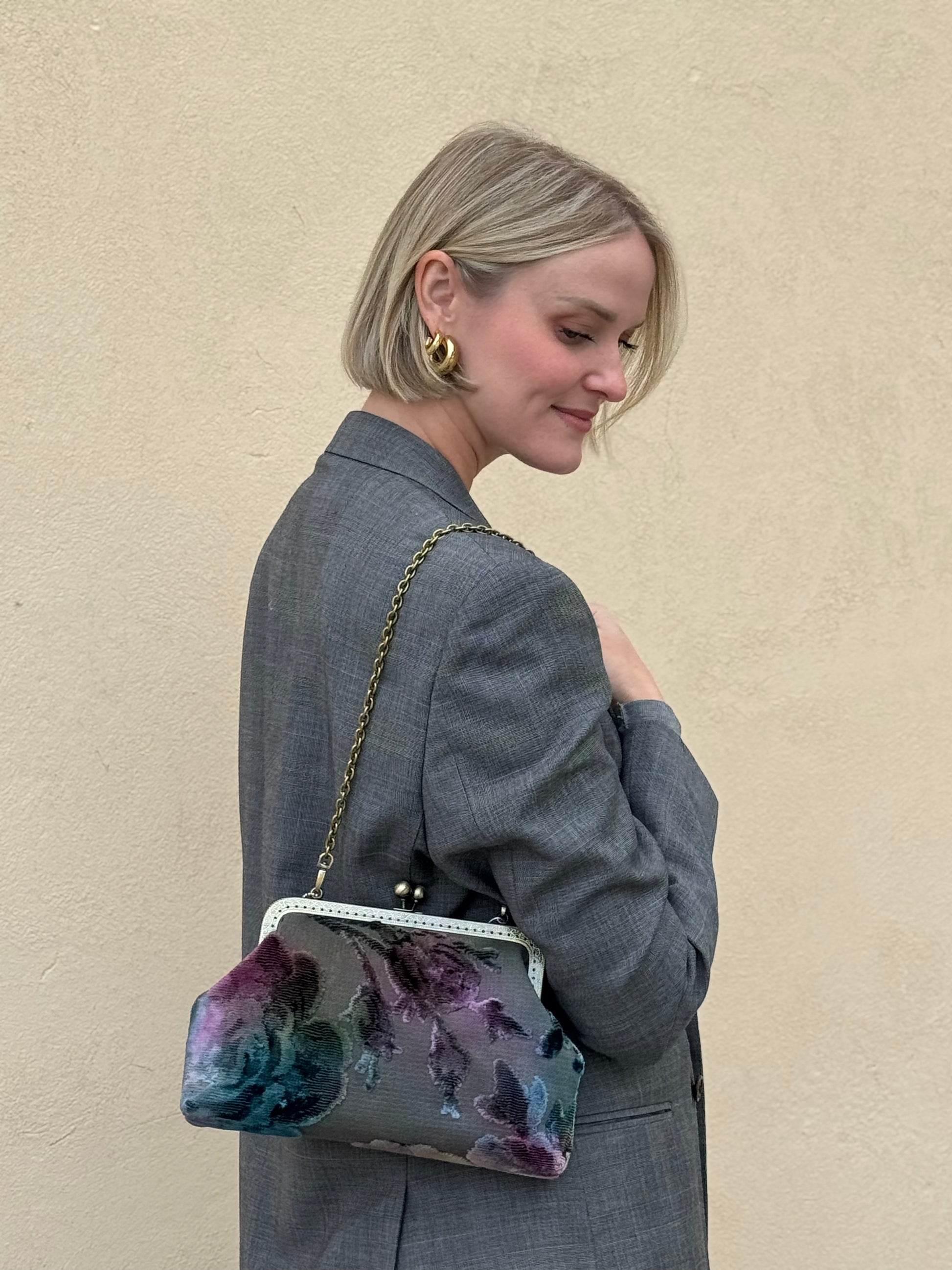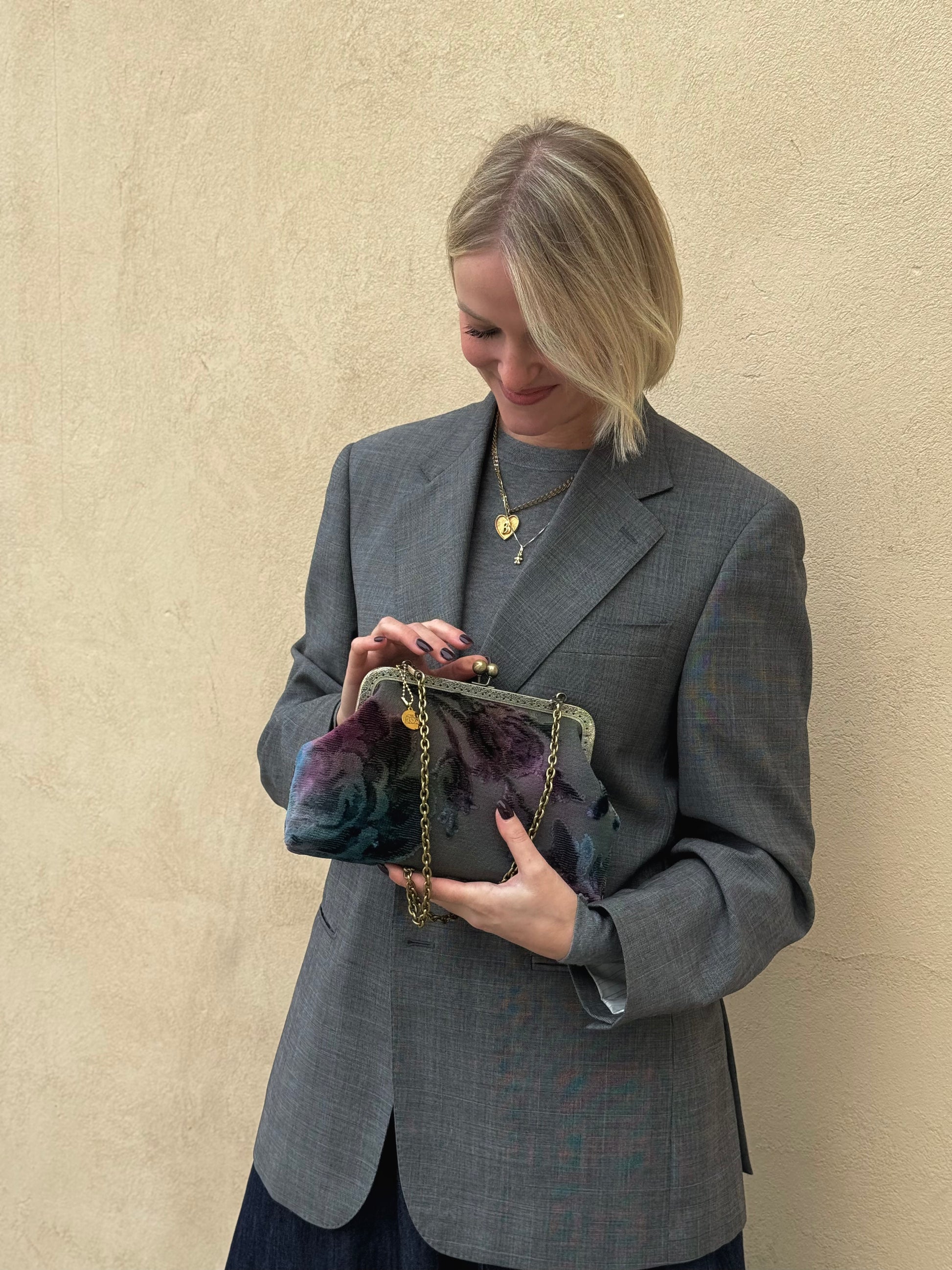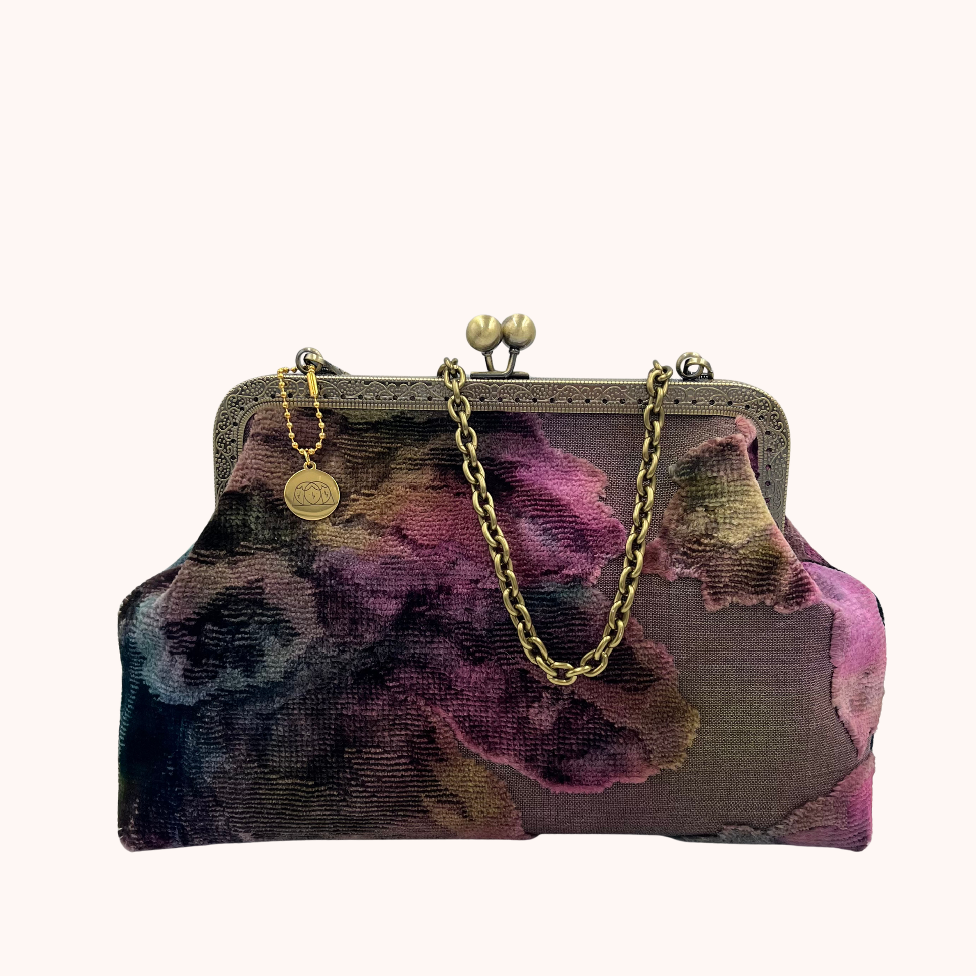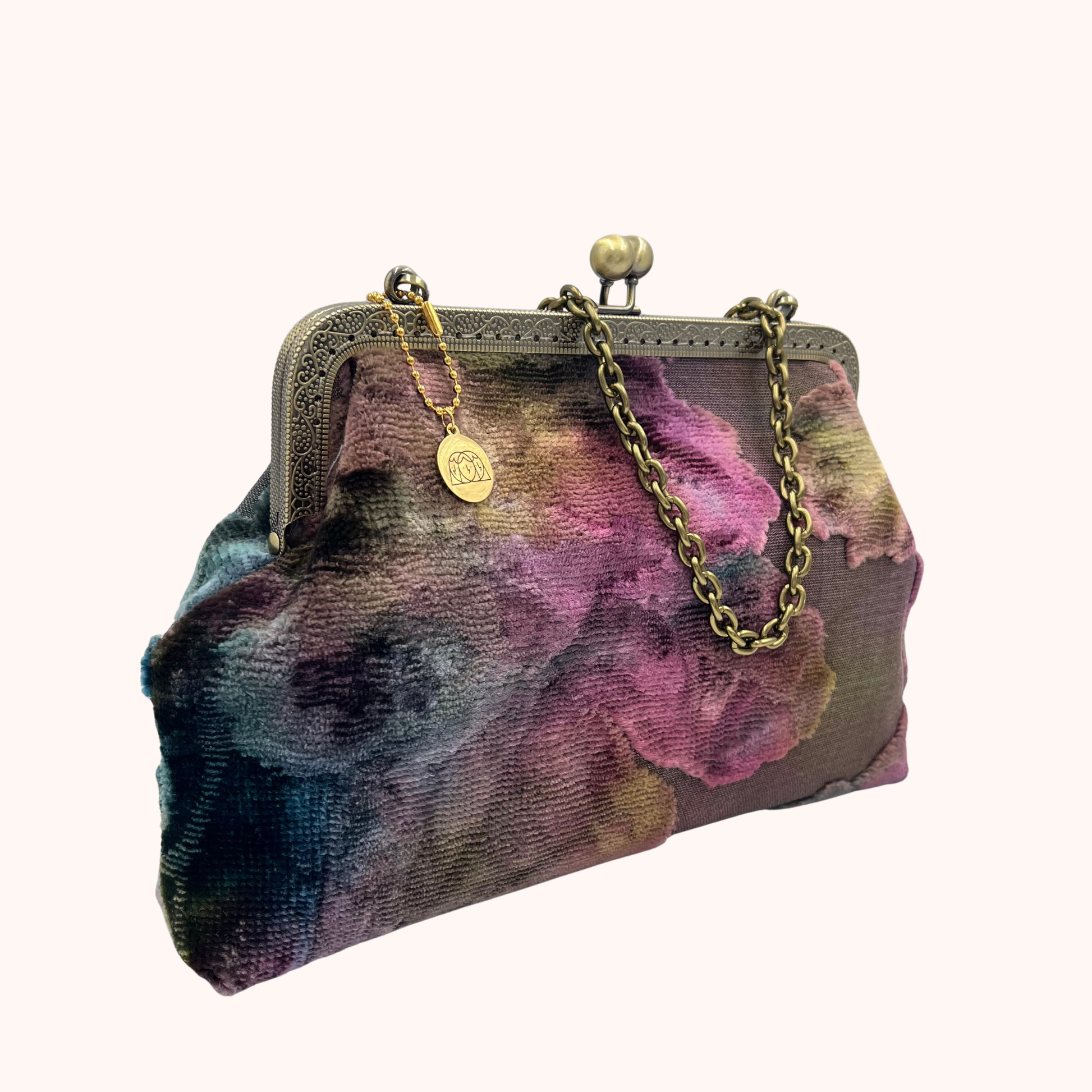 La nostra Glenda Blue Violet è realizzata esternamente in velluto operato, ha una chiusura colore bronzo di 20cm e una catena rimovibile per portarla a spalla che misura 60cm. Al suo interno è foderata in raso e presenta una tasca, anch'essa in raso.
