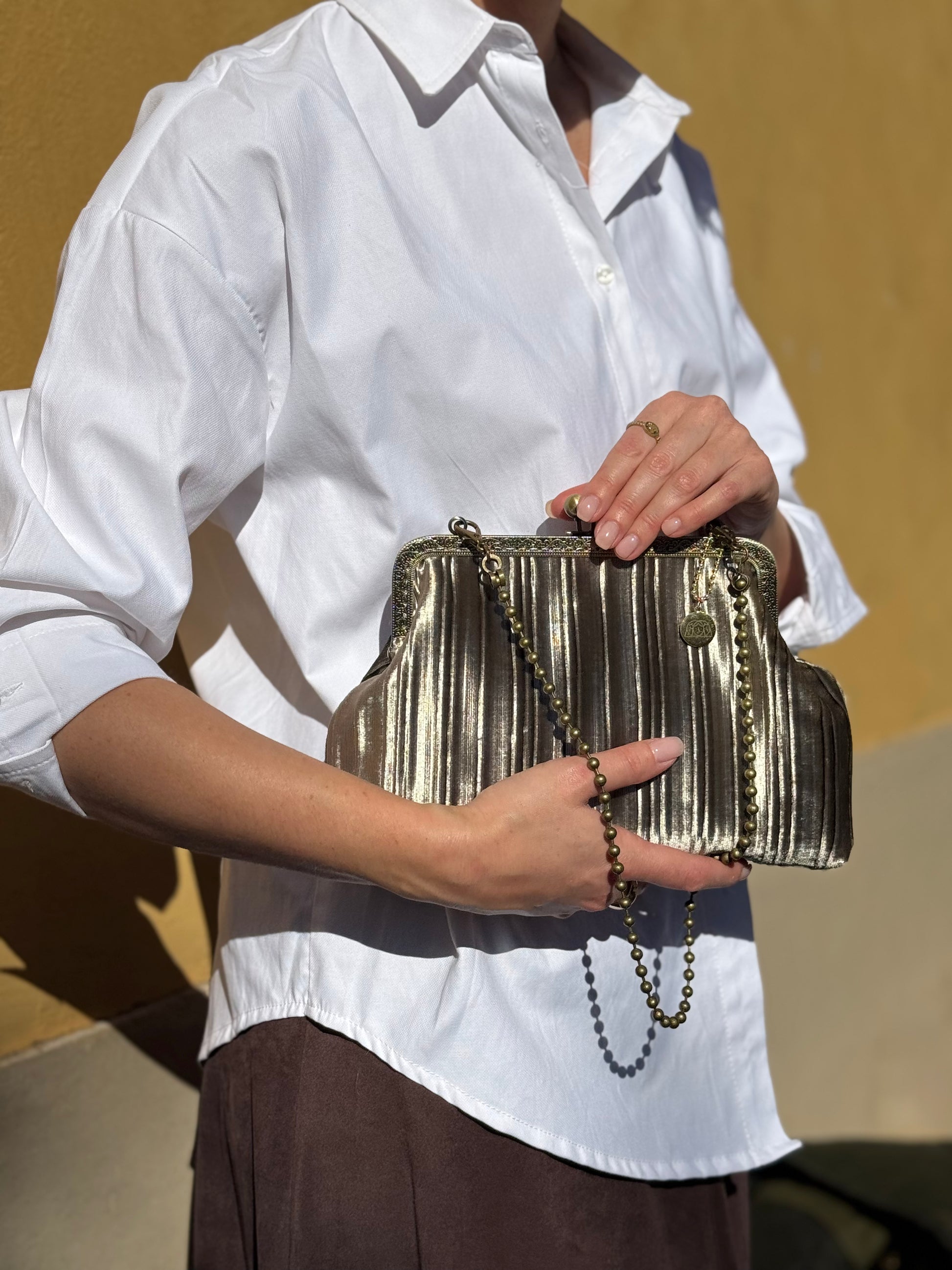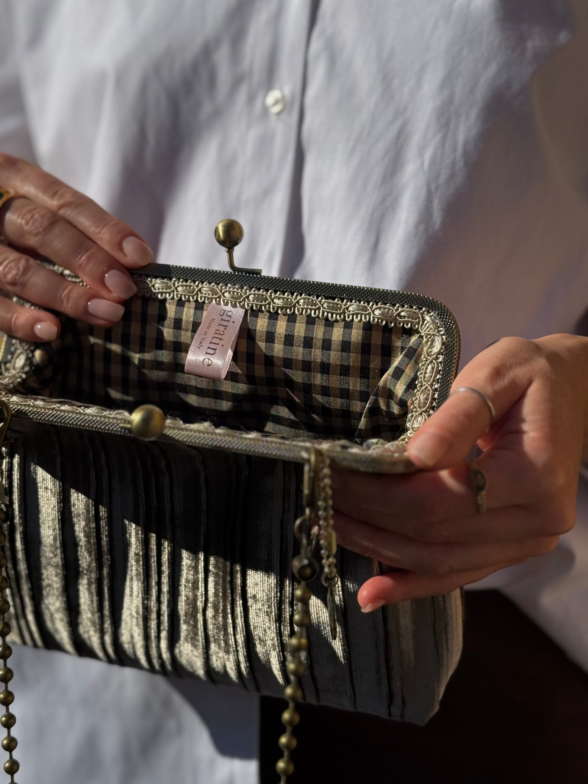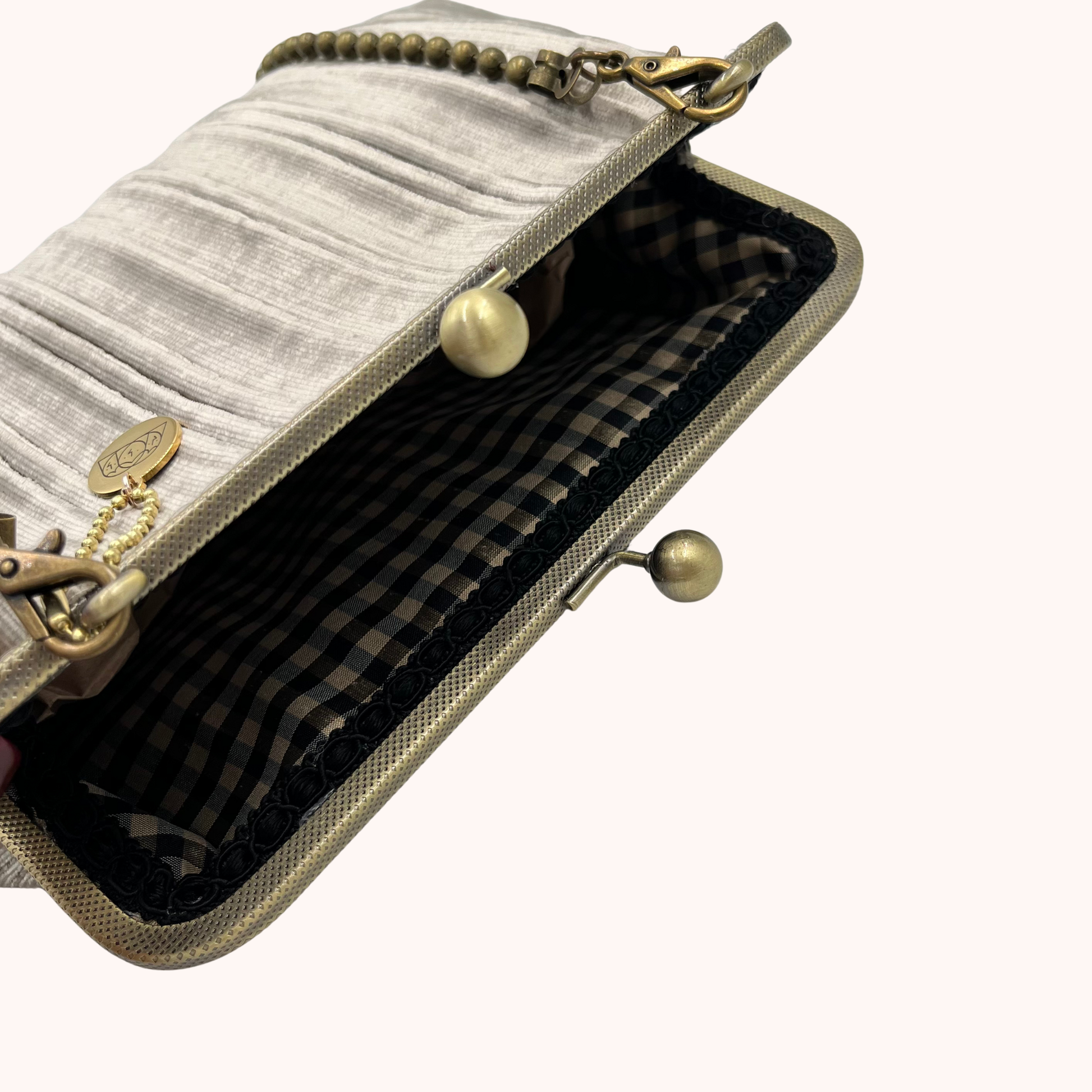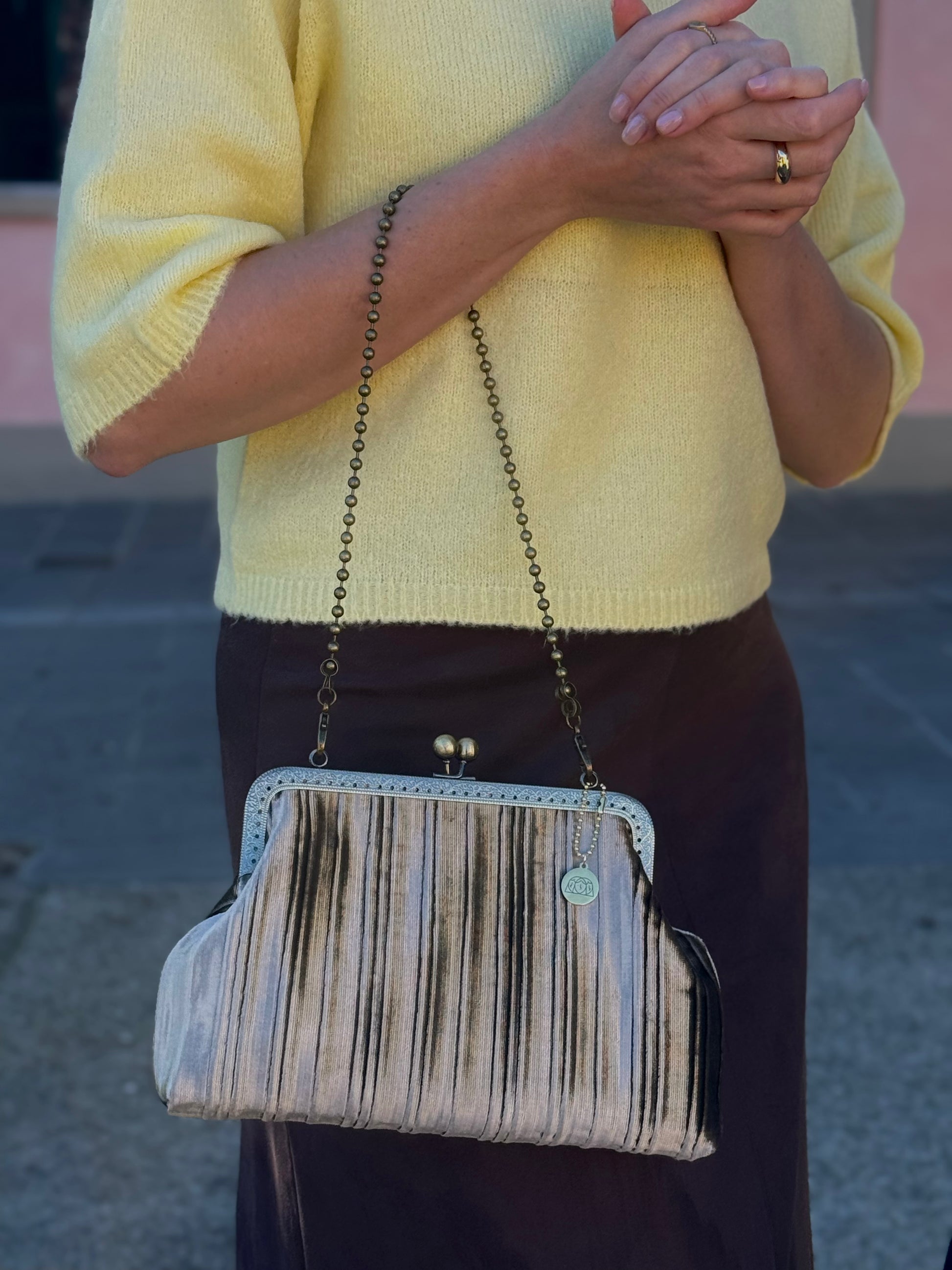 La nostra Glenda Sipario Beige è realizzata esternamente in velluto d'arredo, ha una chiusura colore bronzo di 20cm e una catena rimovibile per portarla a spalla che misura 60cm. Al suo interno è foderata in seta e presenta una tasca, anch'essa in seta.