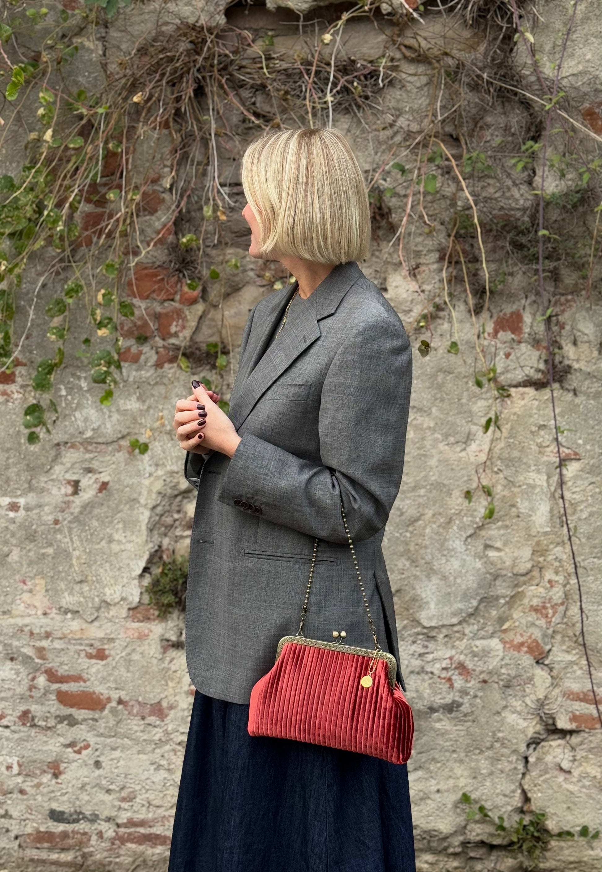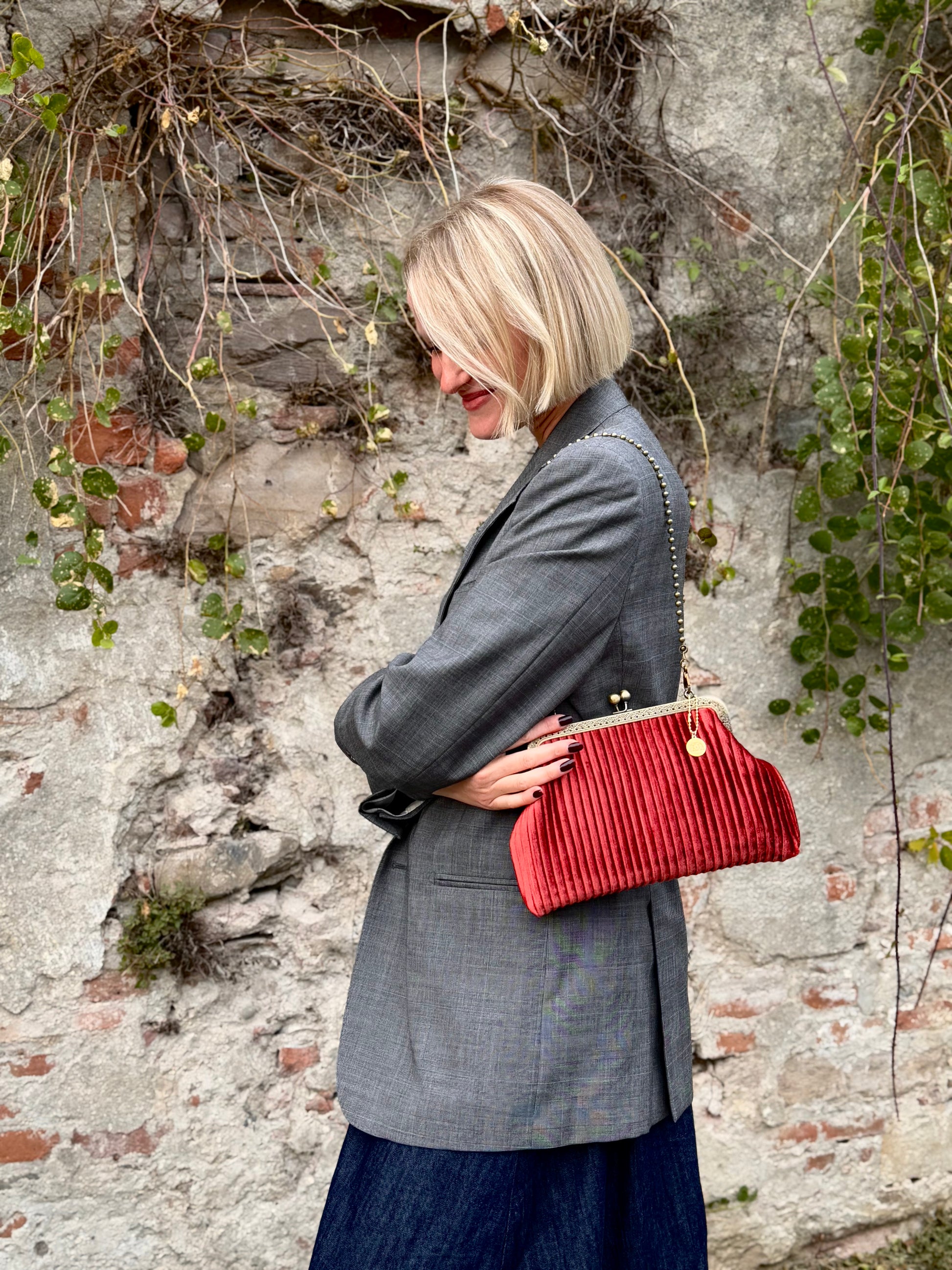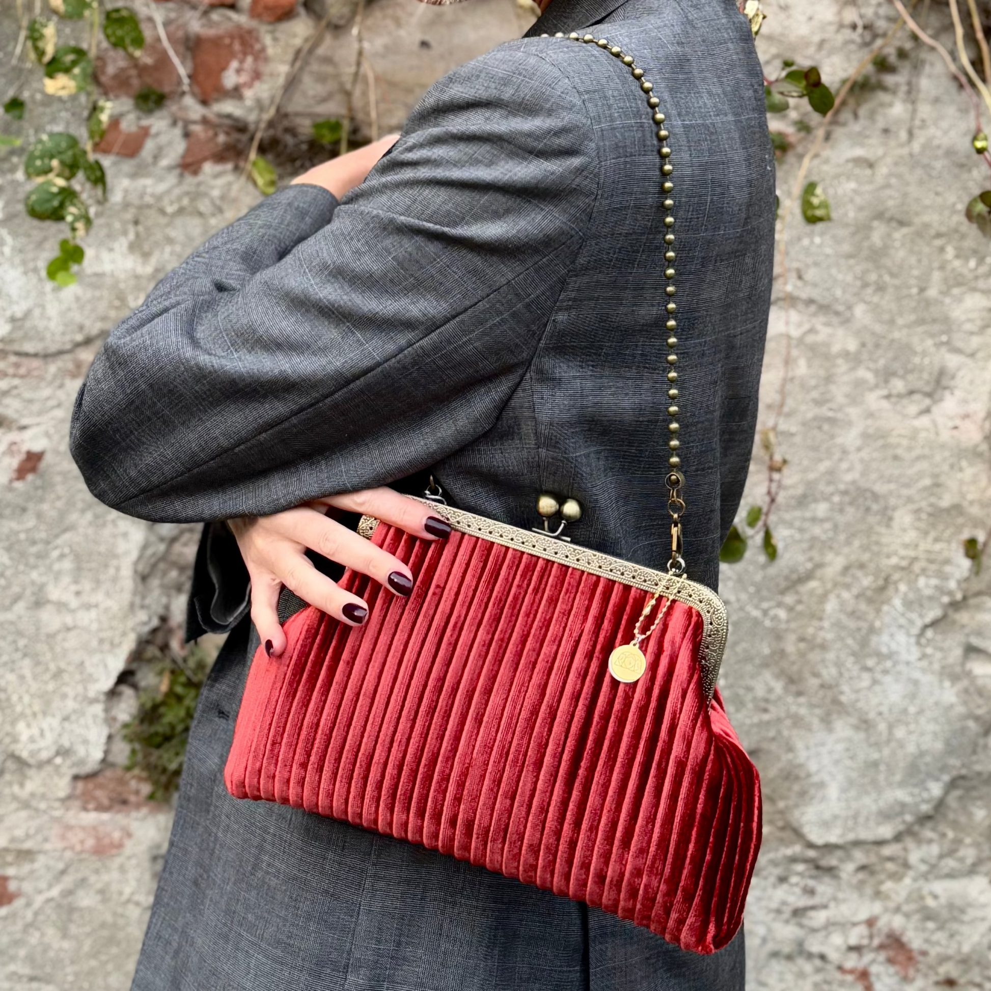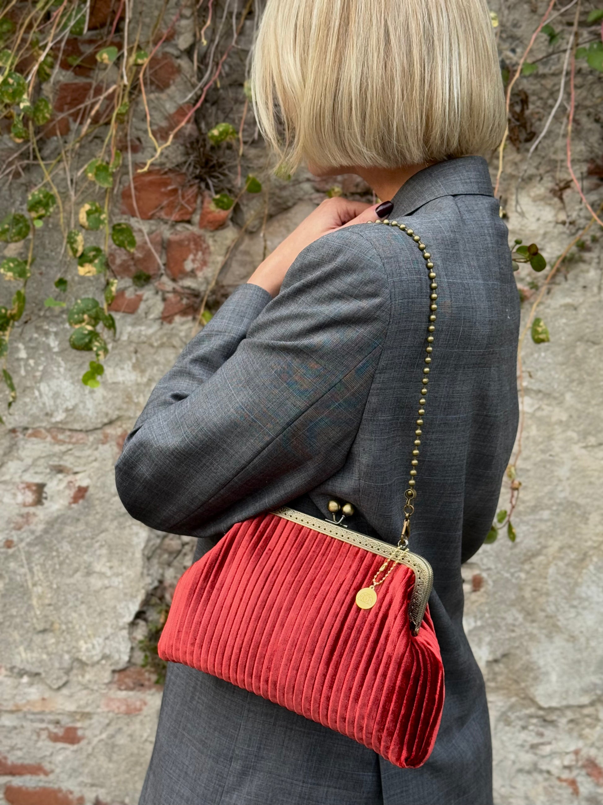 La nostra Glenda Sipario Orange è realizzata esternamente in velluto d'arredo, ha una chiusura colore bronzo di 20cm e una catena rimovibile per portarla a spalla che misura 60cm. Al suo interno è foderata in seta e presenta una tasca, anch'essa in seta.