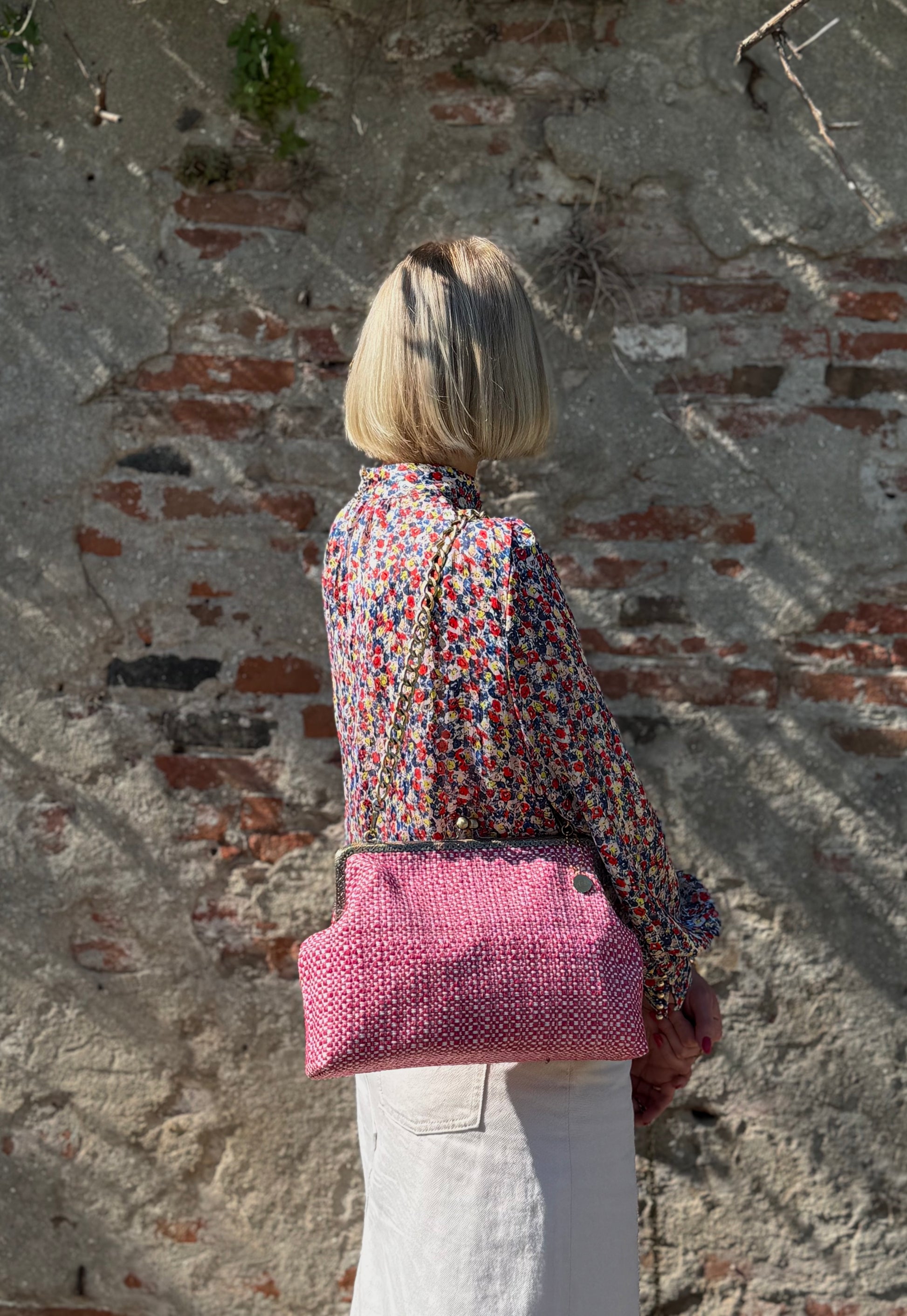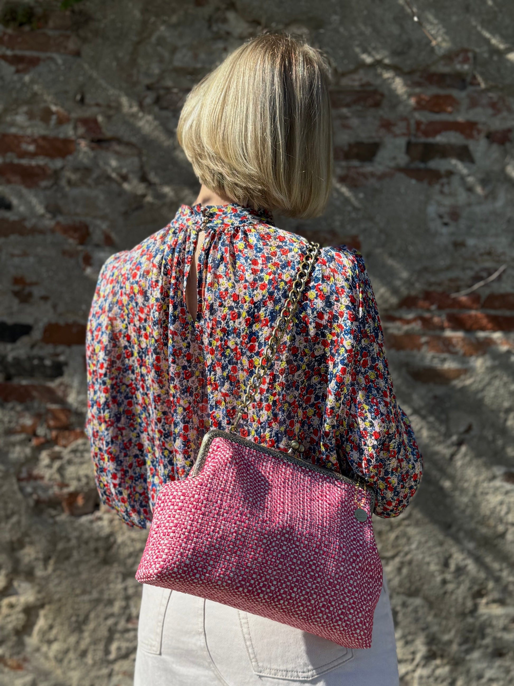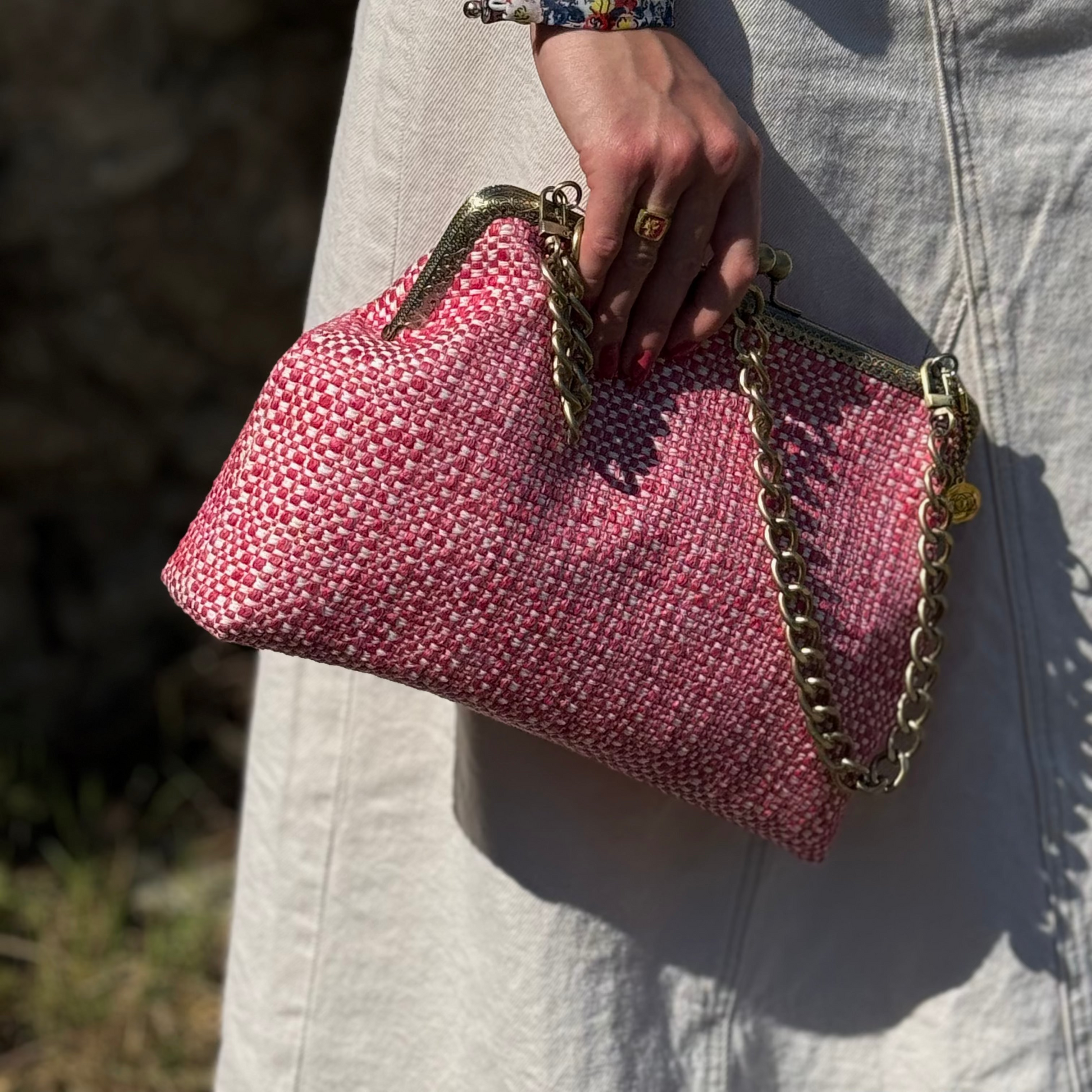 La nostra Isotta Bubblegum è realizzata in tessuto intrecciato, ha una chiusura colore bronzo di 25cm e una catena rimovibile per portarla a spalla. Al suo interno è foderata in raso e presenta una comoda tasca, anch'essa in raso.