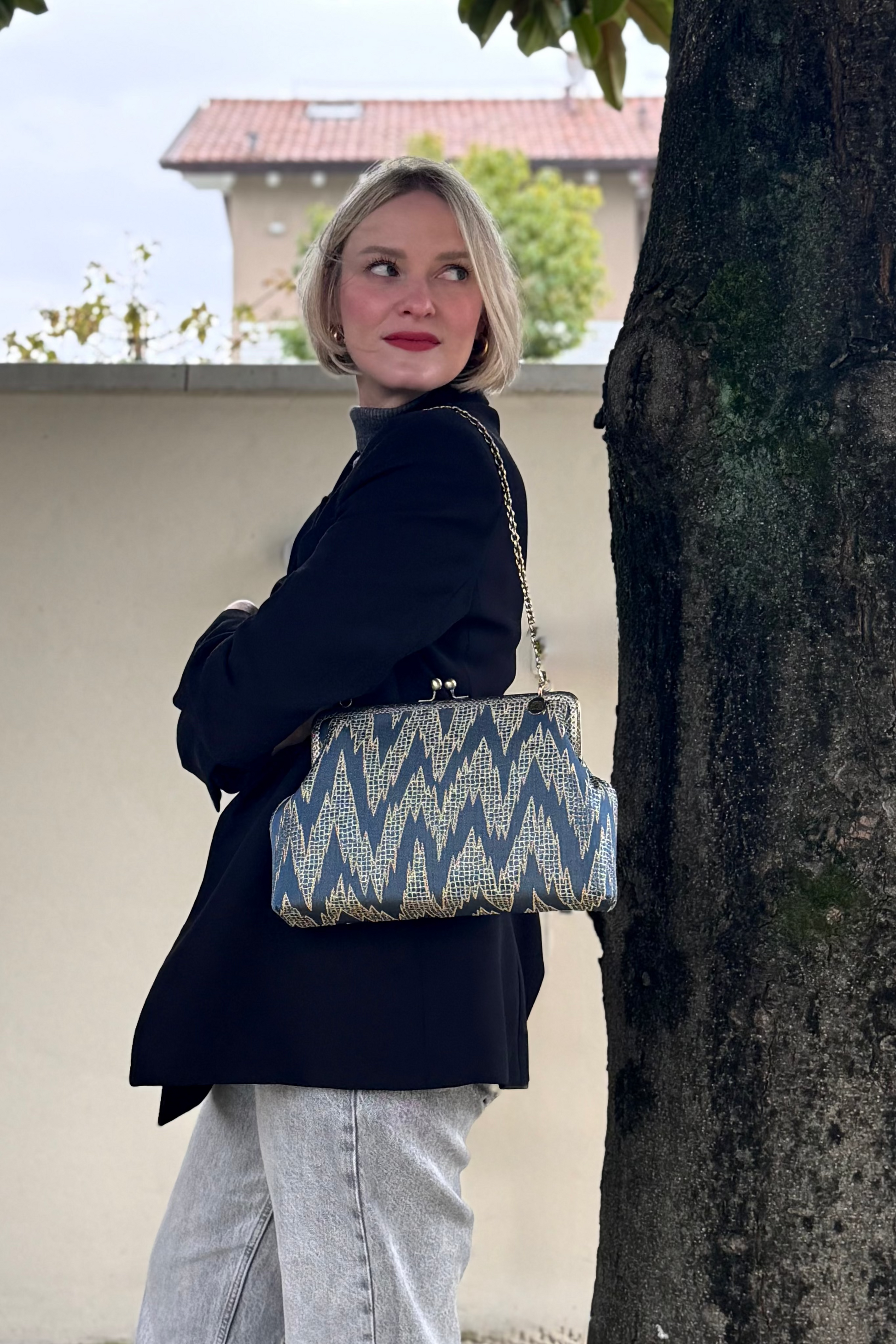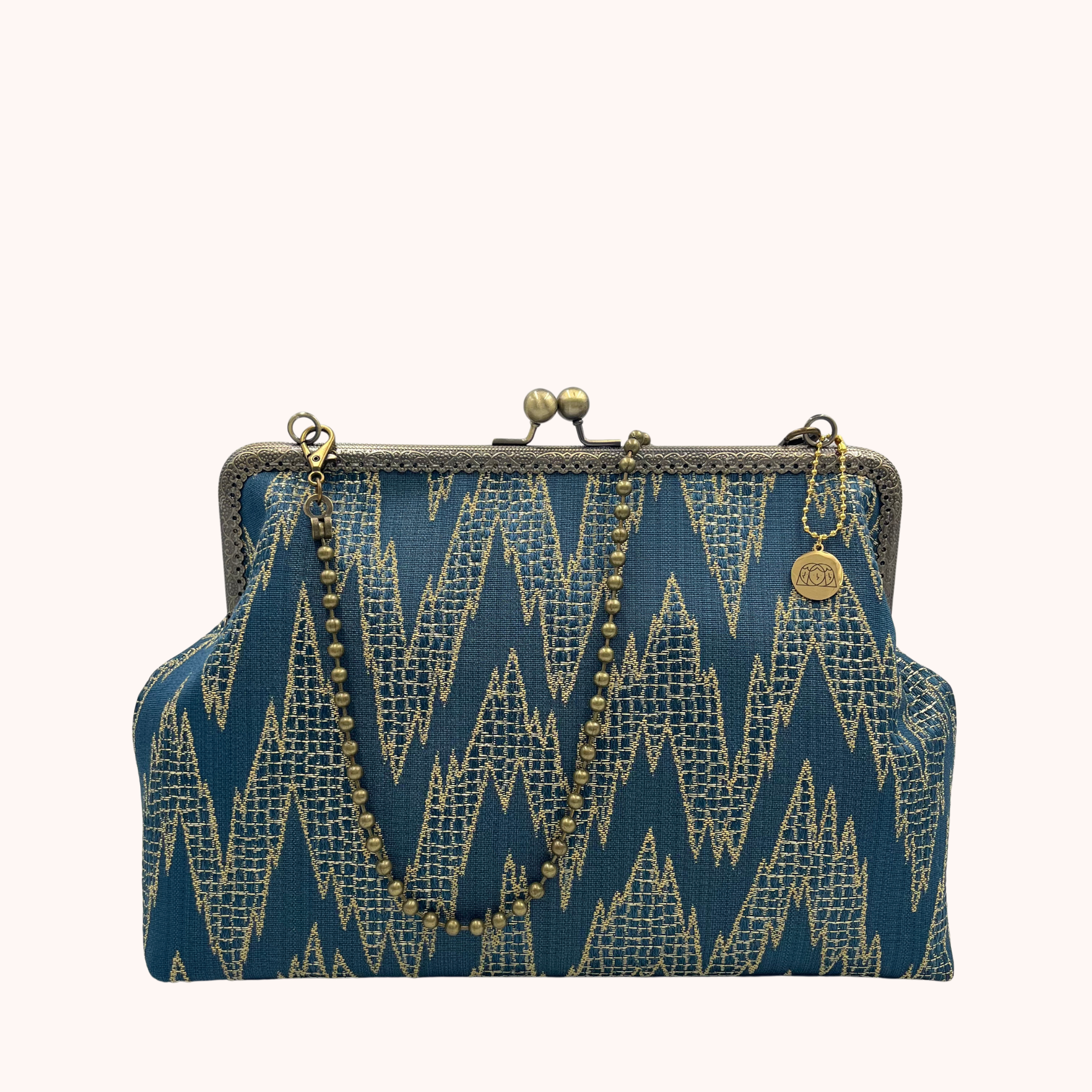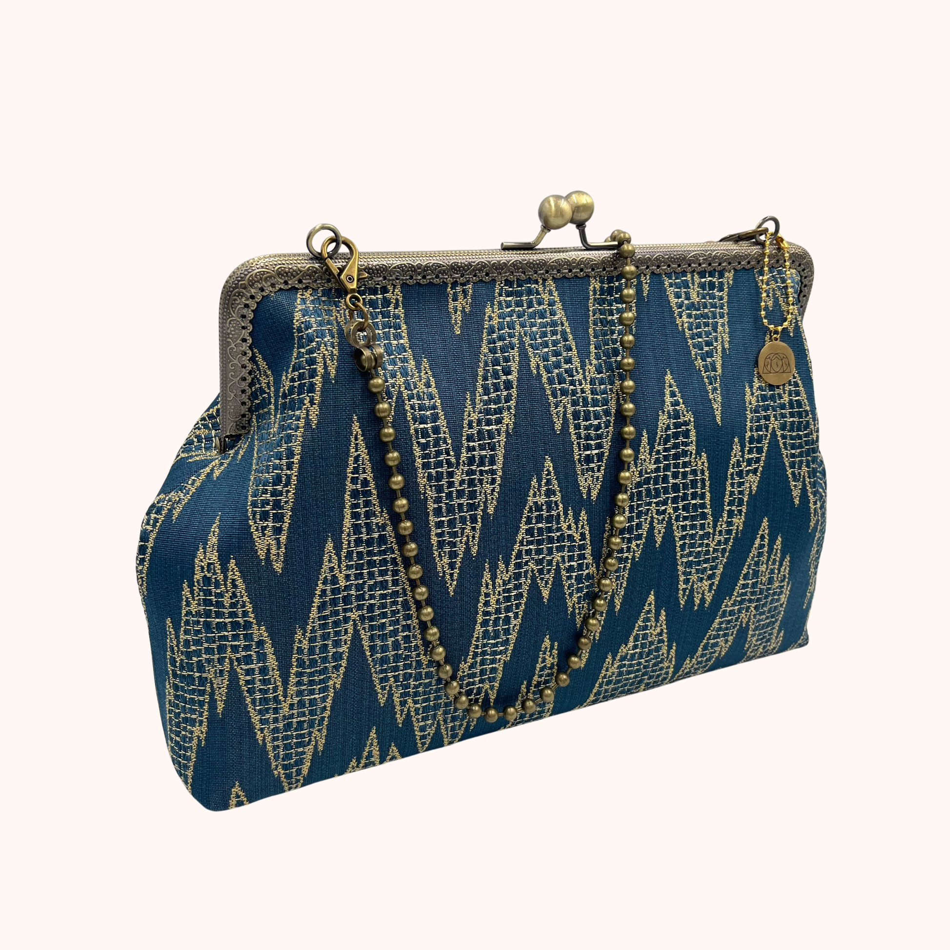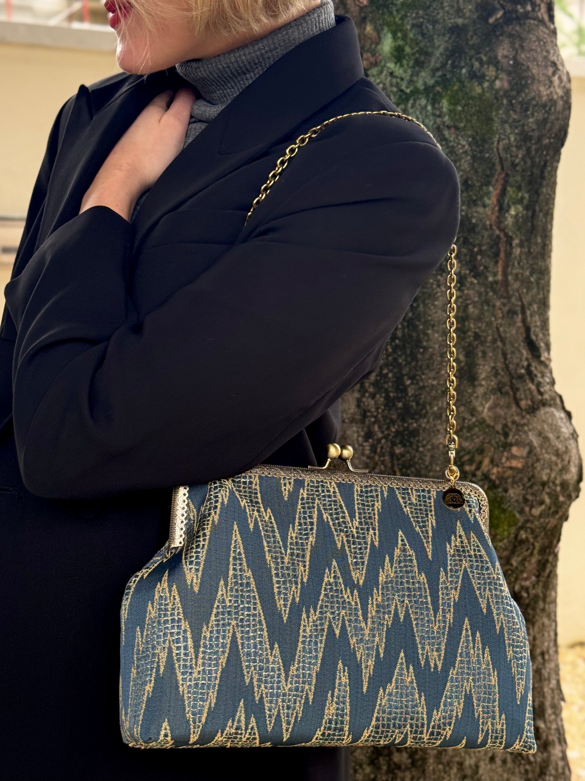 La nostra Isotta Everest è realizzata in tessuto d'arredo, ha una chiusura colore bronzo di 25cm e una catena rimovibile per portarla a spalla. Al suo interno è foderata in raso e presenta una comoda tasca, anch'essa in raso.