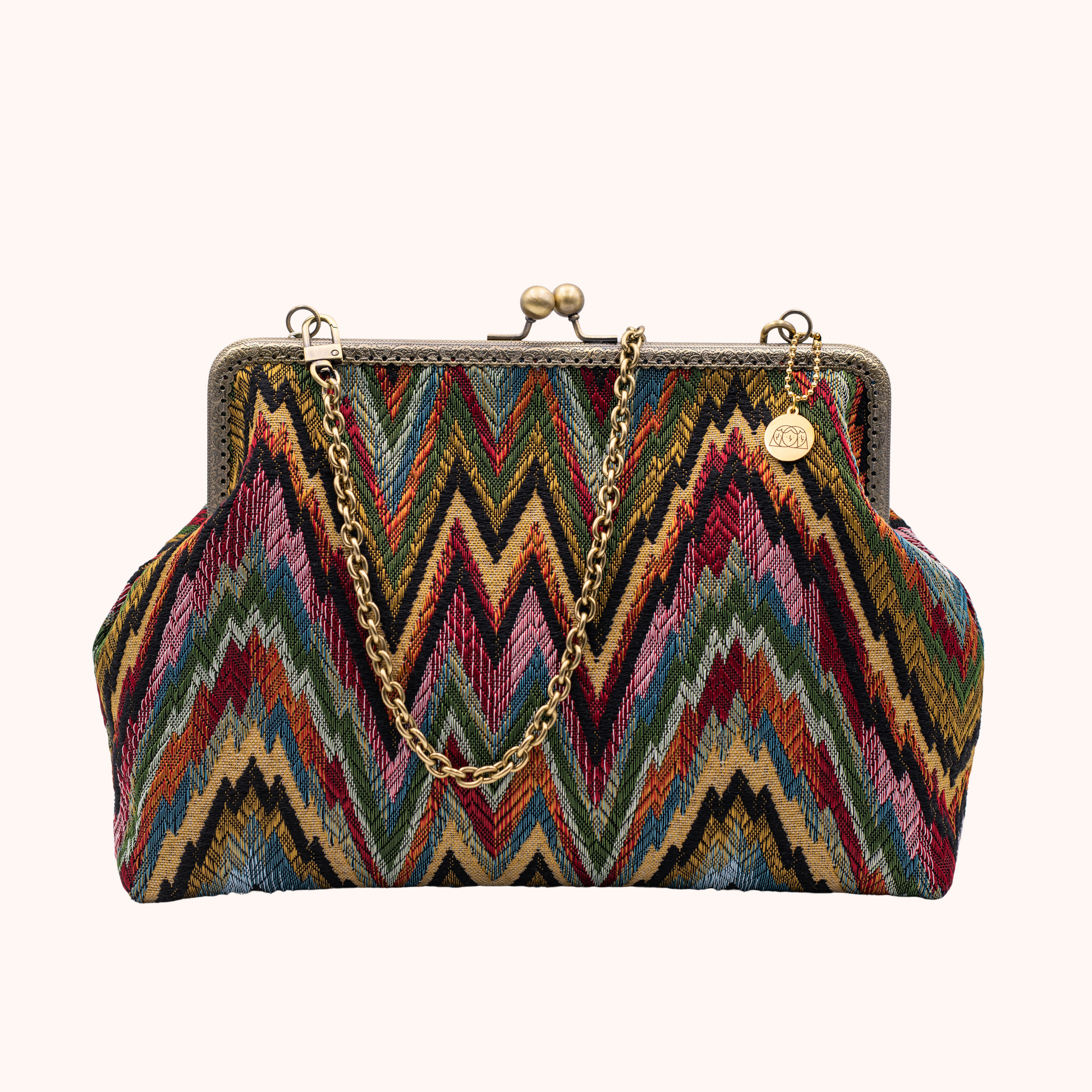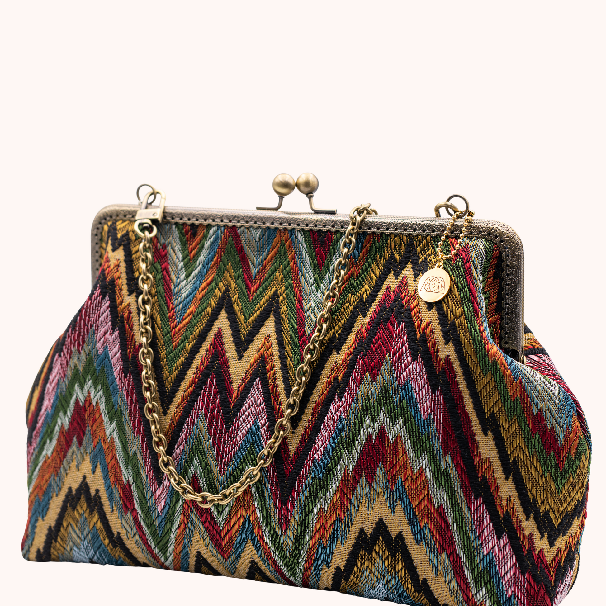 La nostra Isotta Ottavia è realizzata in gobelin, ha una chiusura colore bronzo di 25cm e una catena rimovibile per portarla a spalla. Al suo interno è foderata in raso e presenta una comoda tasca, anch'essa in raso.