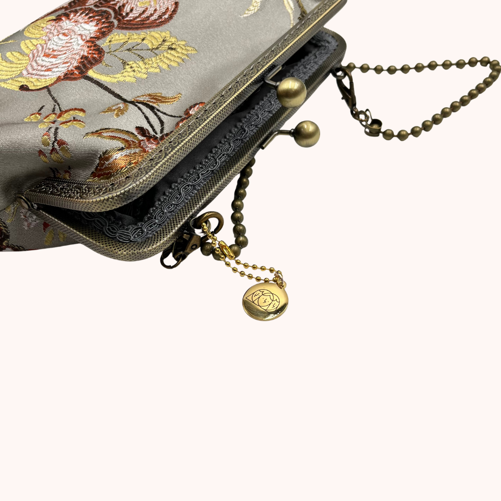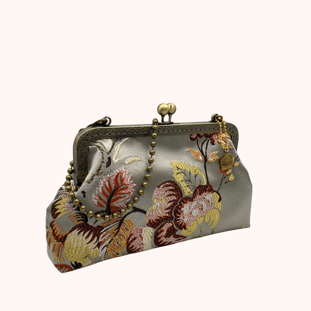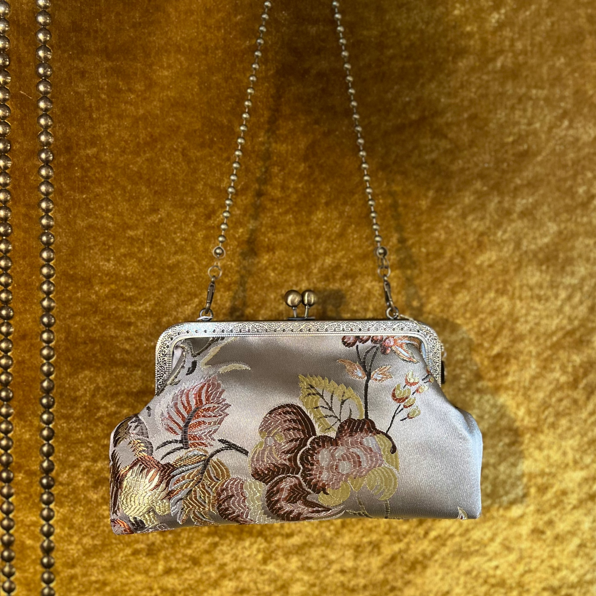 La nostra Lea Chateau Silver è realizzata in tessuto damascato, ha una chiusura colore bronzo di 20cm e una catena rimovibile di 60cm, al suo interno è foderata in raso.