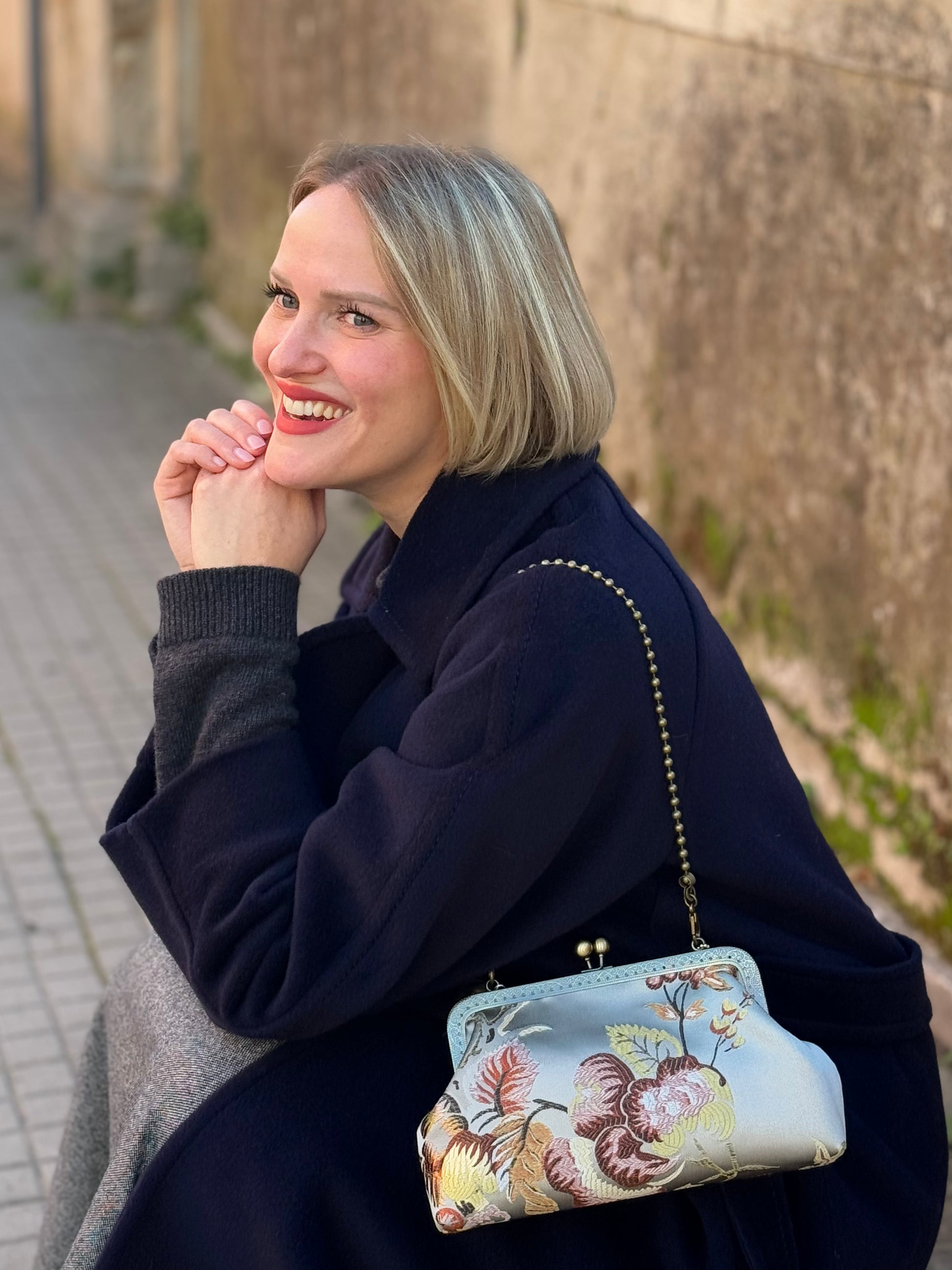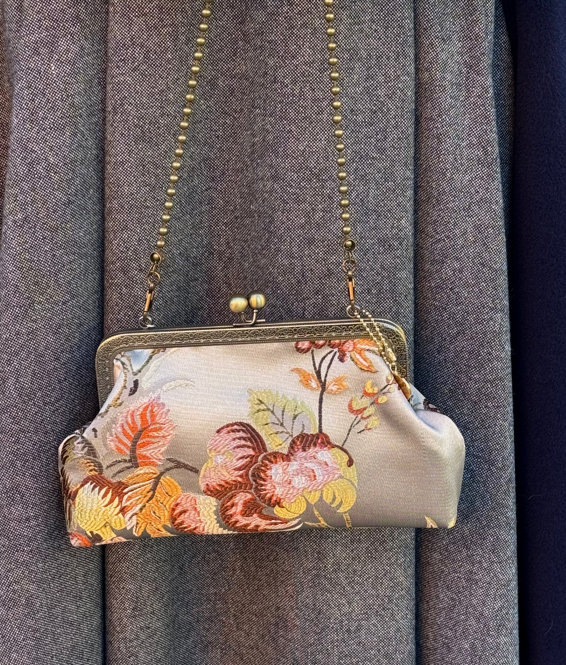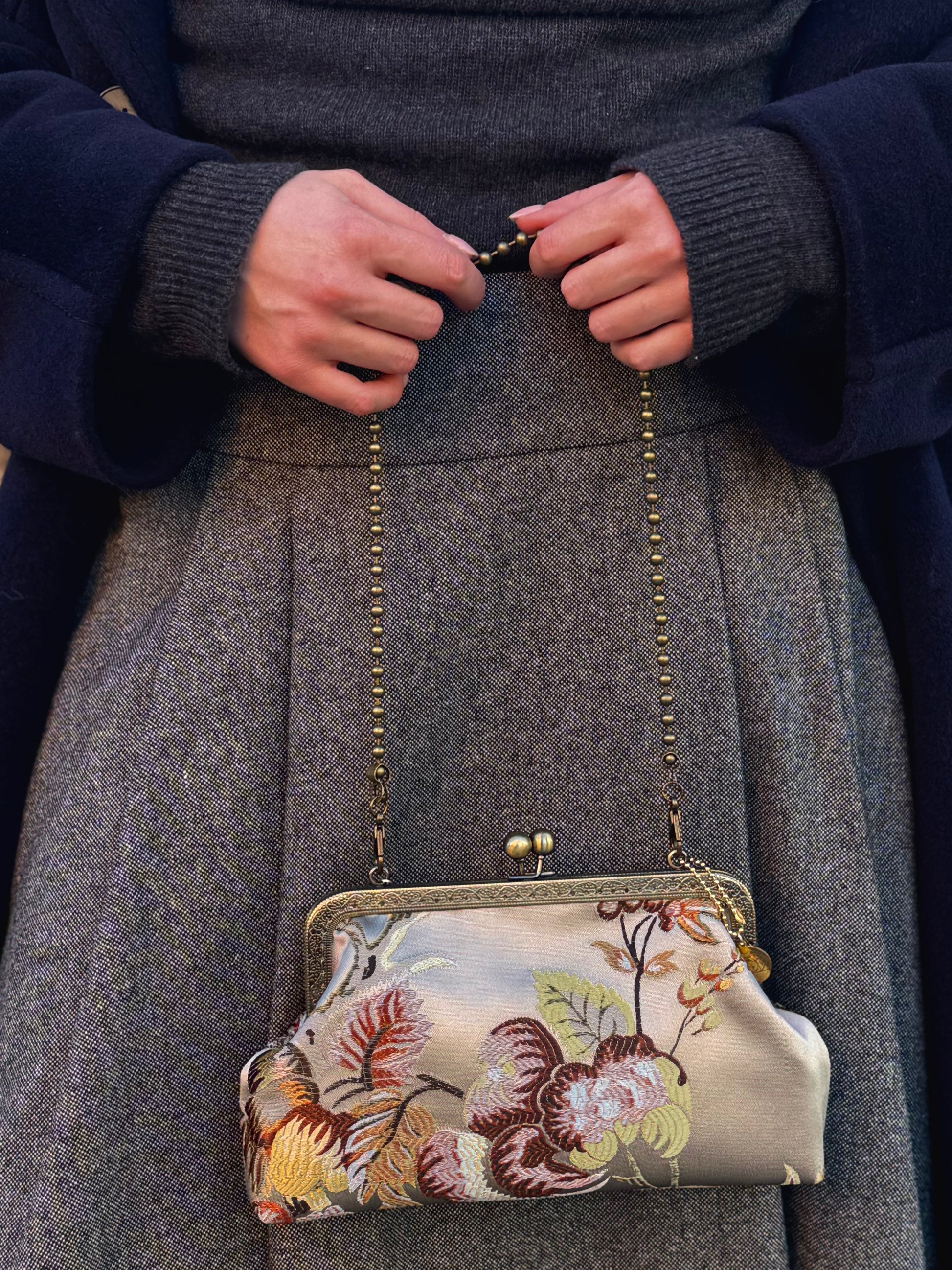 La nostra Lea Chateau Silver è realizzata in tessuto damascato, ha una chiusura colore bronzo di 20cm e una catena rimovibile di 60cm, al suo interno è foderata in raso.