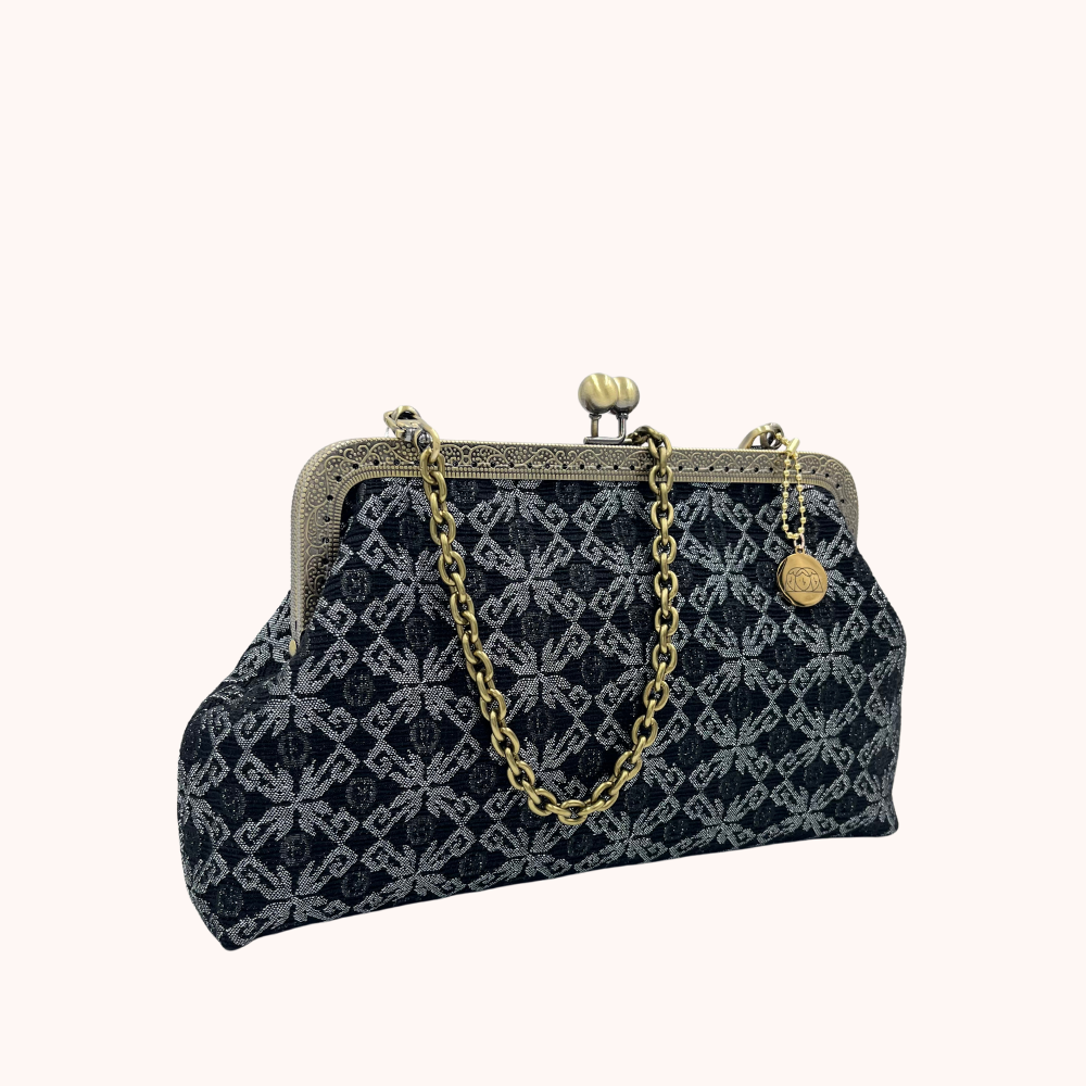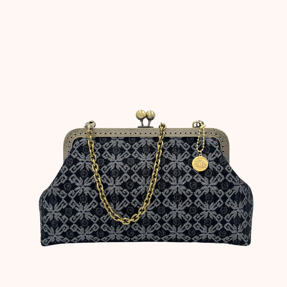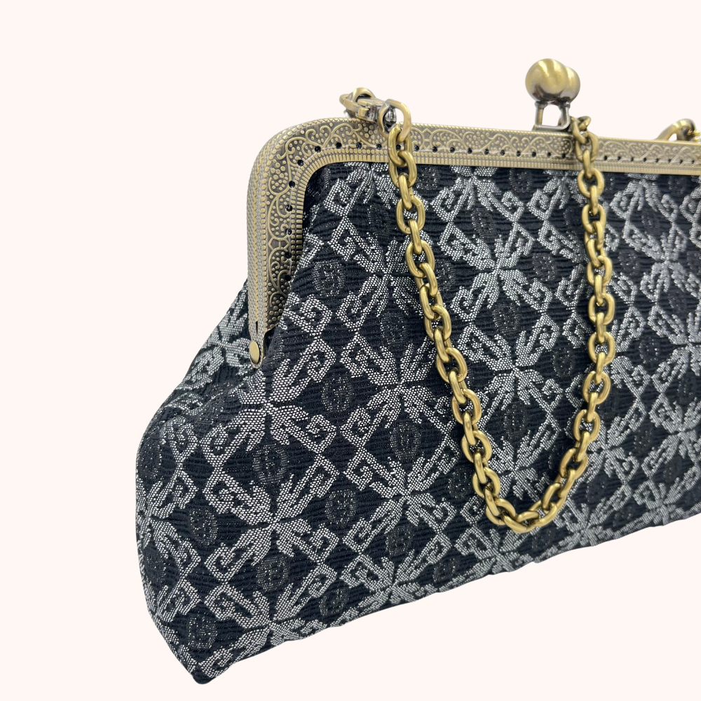 La nostra Lea Midnight è realizzata in tessuto d'arredo, ha una chiusura colore bronzo di 20cm e una catena rimovibile di 60cm, al suo interno è foderata in raso.