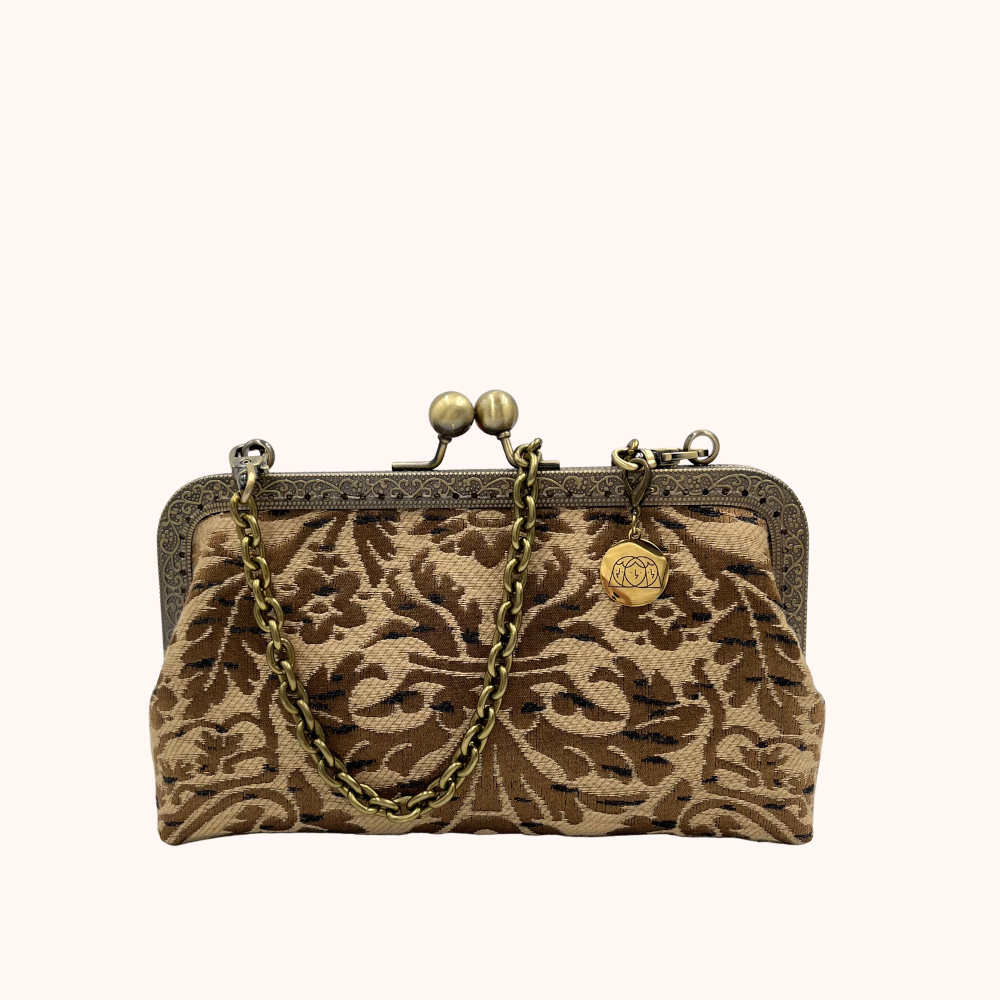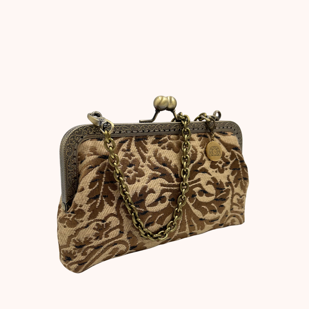 Luna Cross Bronzo– Mini borsa artigianale realizzata in pregiato tessuto d'arredo con interni in raso, pensata per custodire il cellulare con stile. Un portacellulare elegante e unico, con tracolla in metallo e chiusura clic clac.