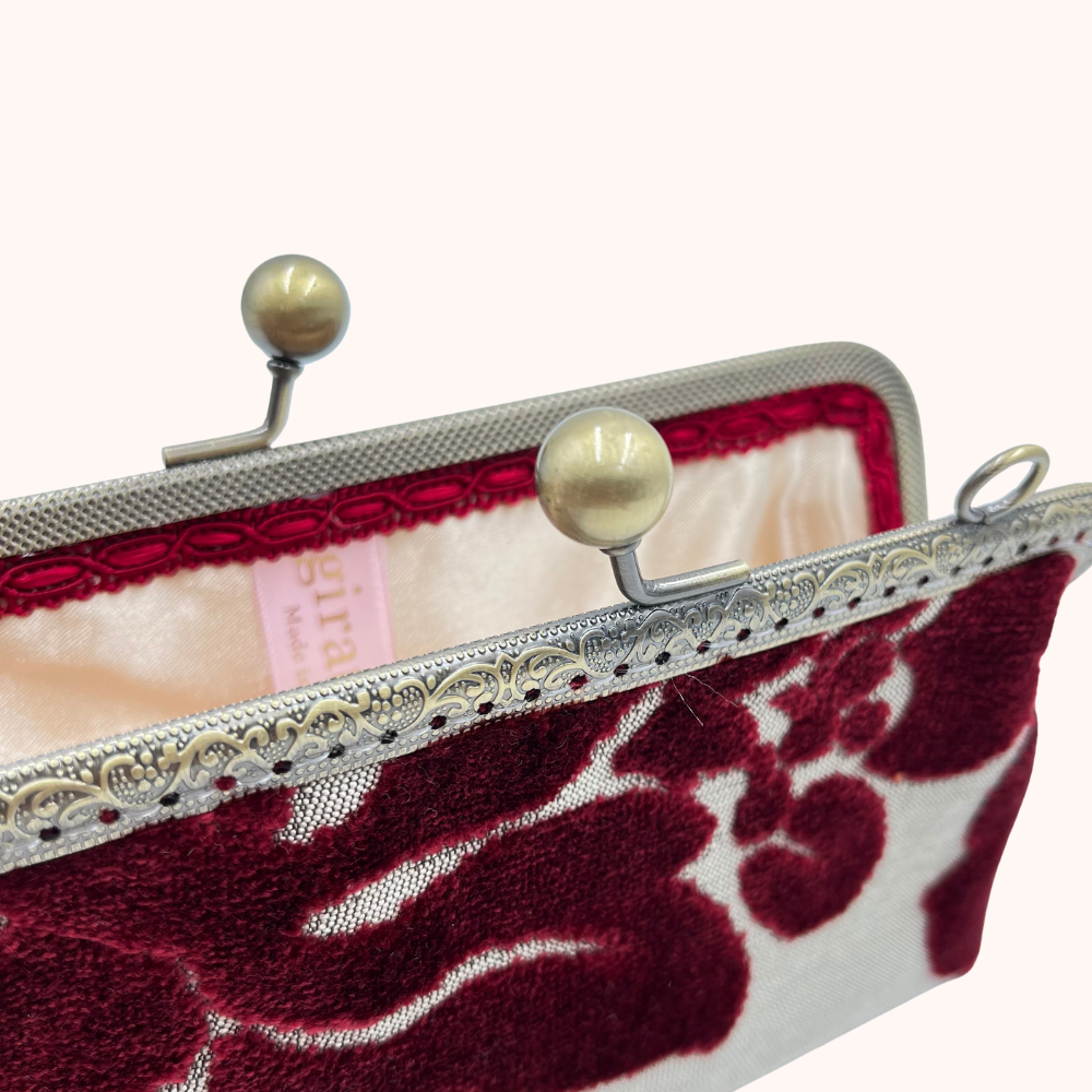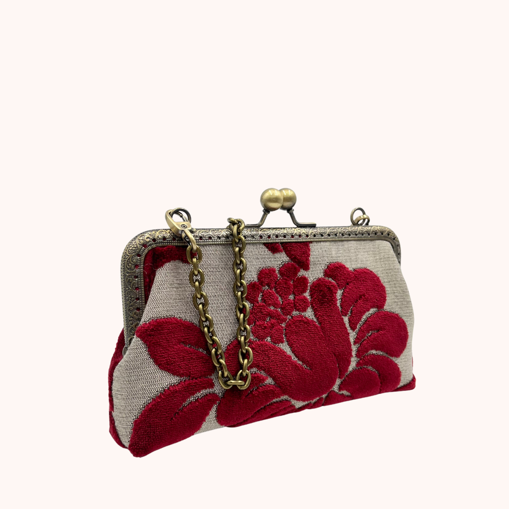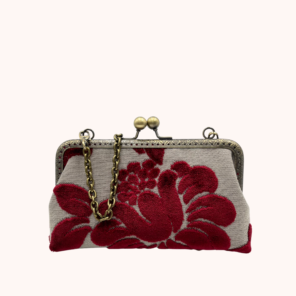 Luna Cross Carminio – Mini borsa artigianale realizzata in pregiato velluto d'arredo con interni in raso, pensata per custodire il cellulare con stile. Un portacellulare elegante e unico, con tracolla in metallo e chiusura clic clac.