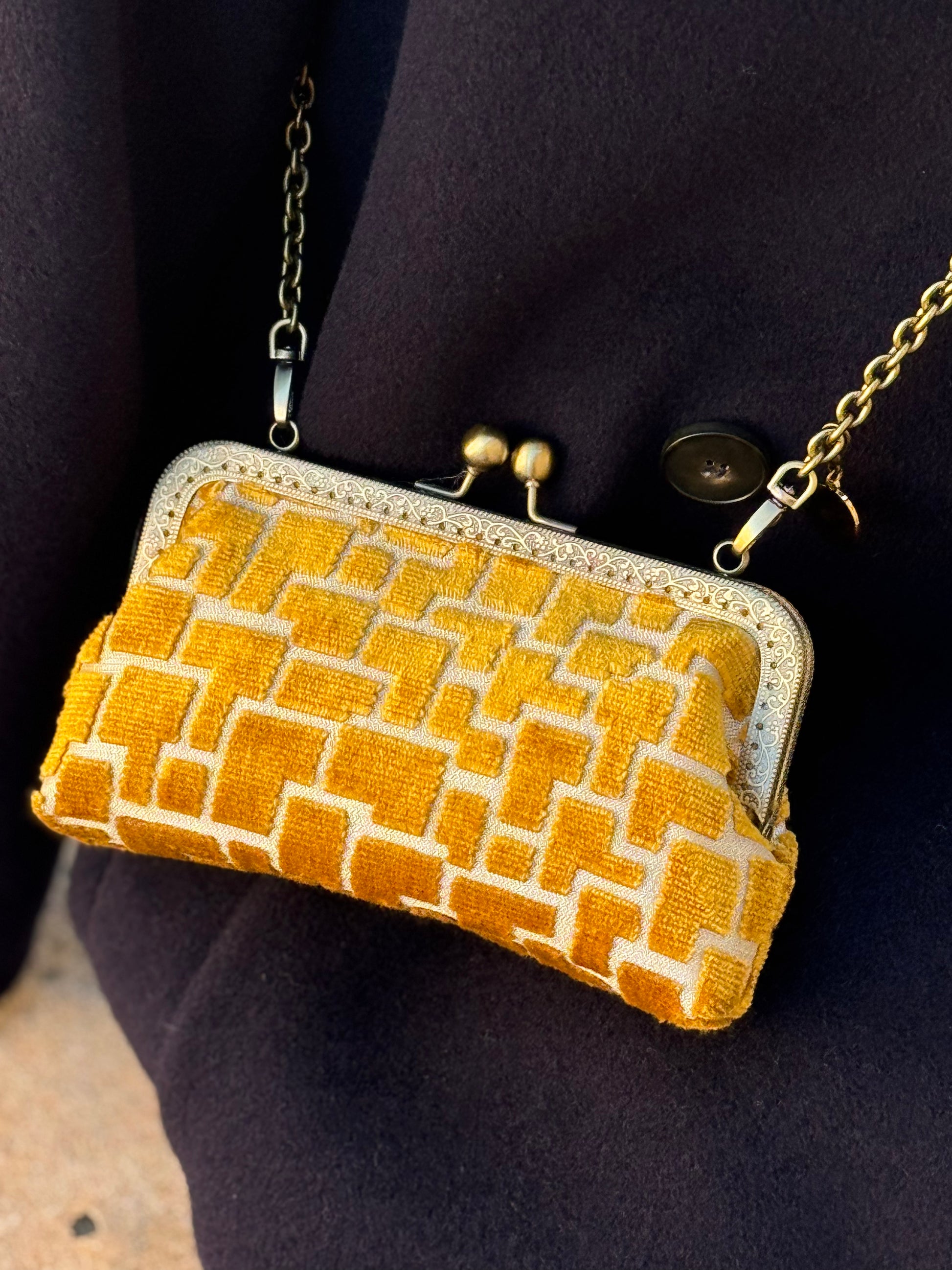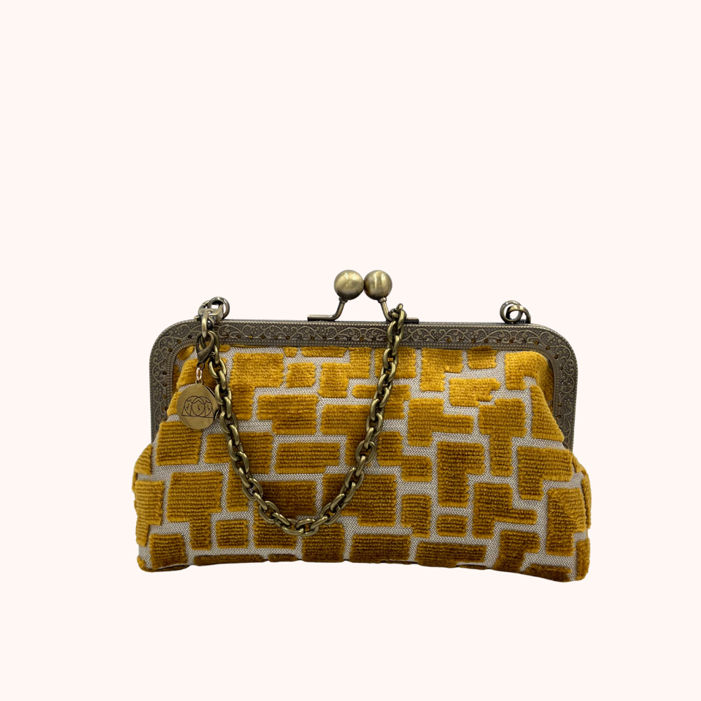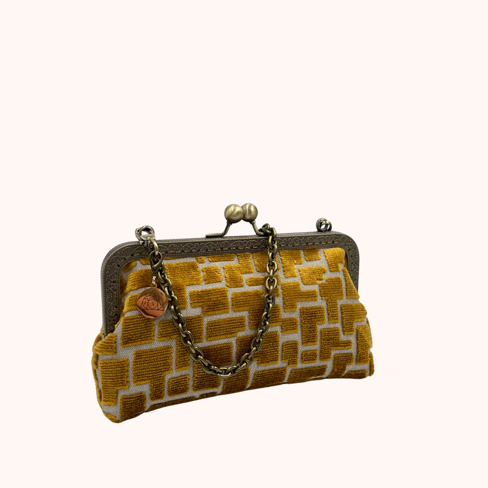 Luna Cross Golden– Mini borsa artigianale realizzata in pregiato velluto d'arredo con interni in raso, pensata per custodire il cellulare con stile. Un portacellulare elegante e unico, con tracolla in metallo e chiusura clic clac.