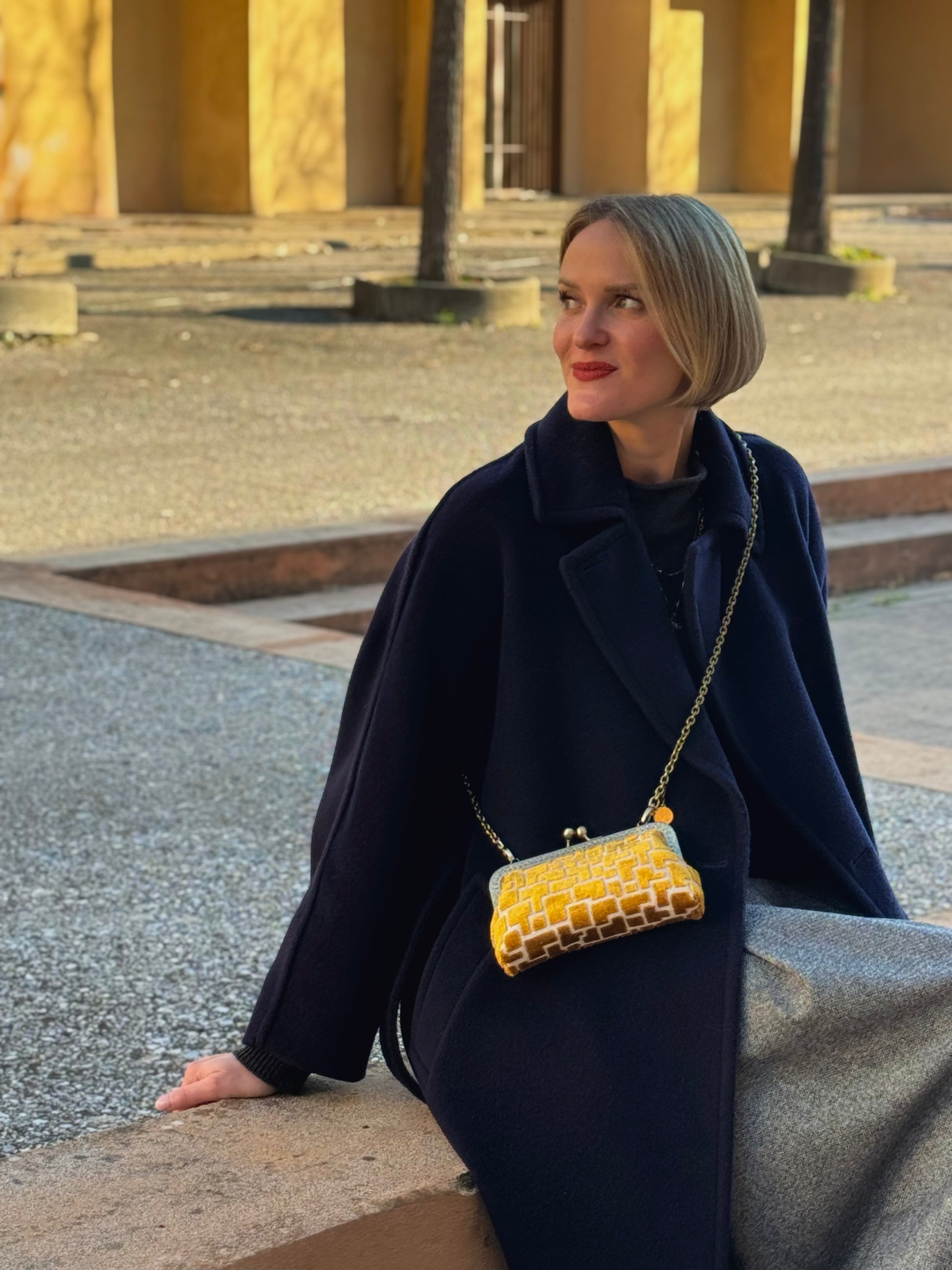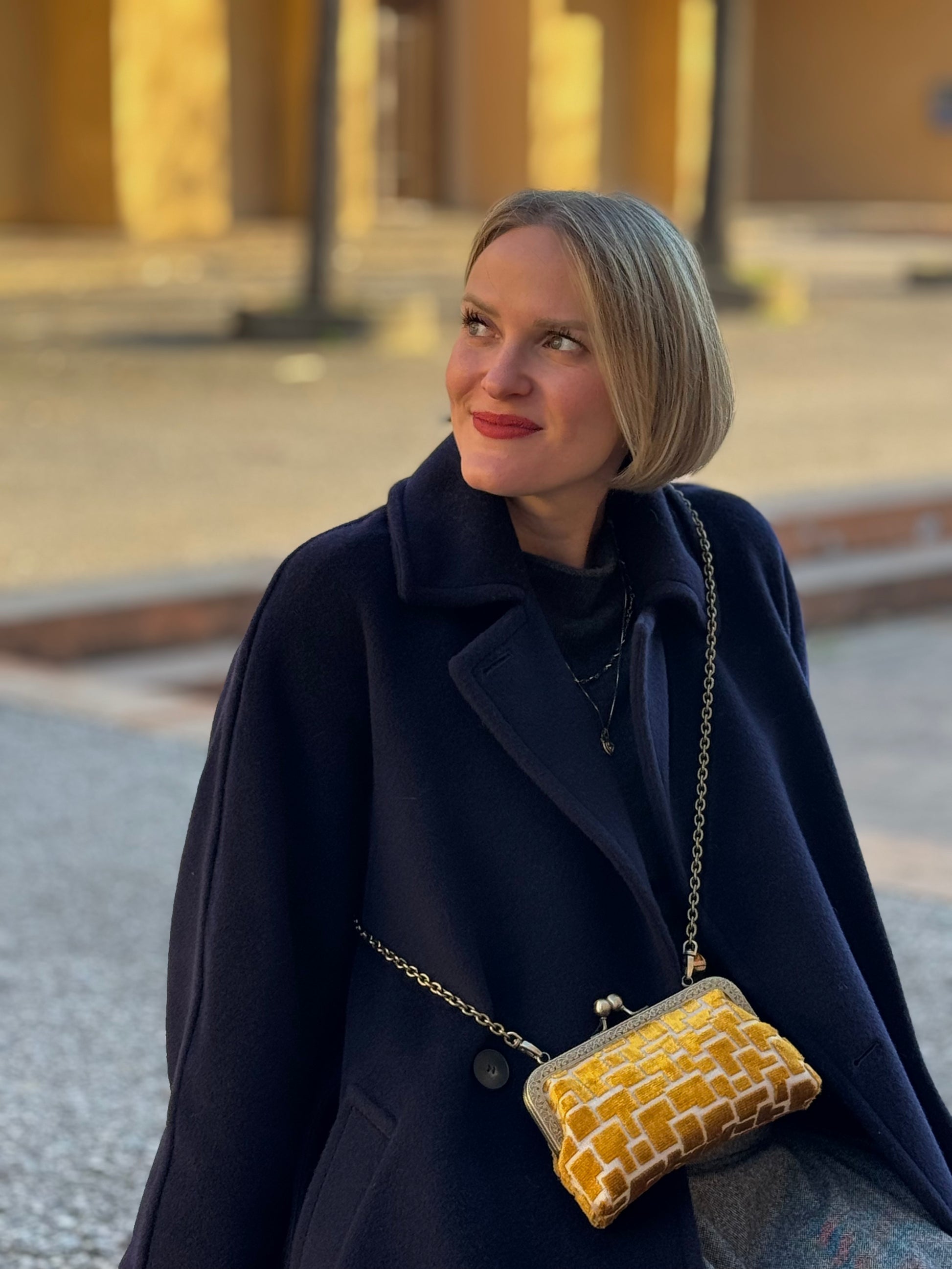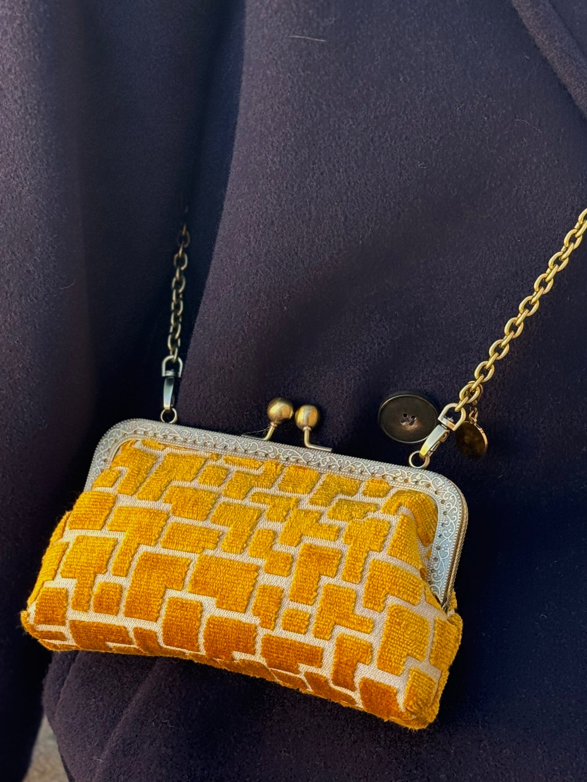 Luna Cross Golden– Mini borsa artigianale realizzata in pregiato velluto d'arredo con interni in raso, pensata per custodire il cellulare con stile. Un portacellulare elegante e unico, con tracolla in metallo e chiusura clic clac.