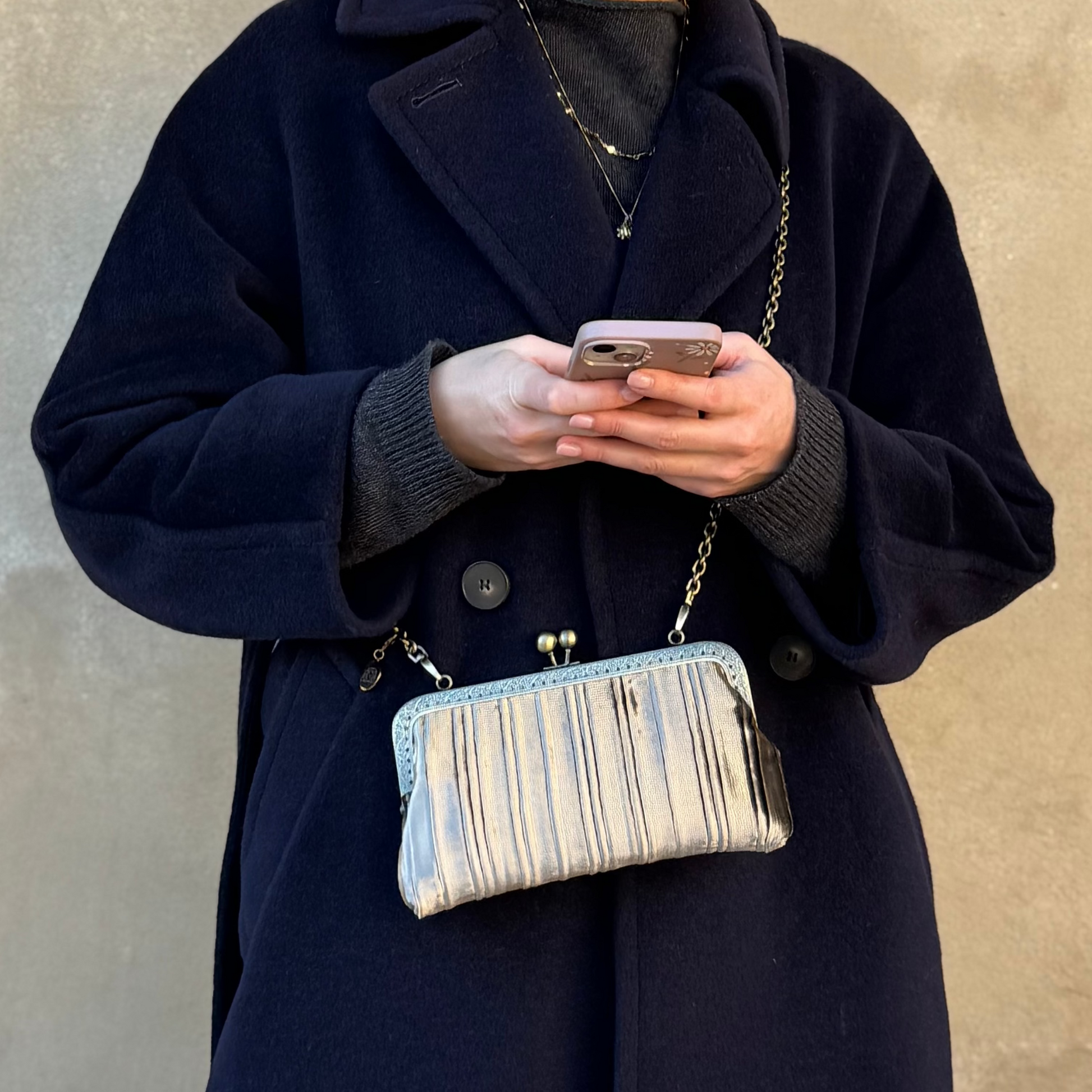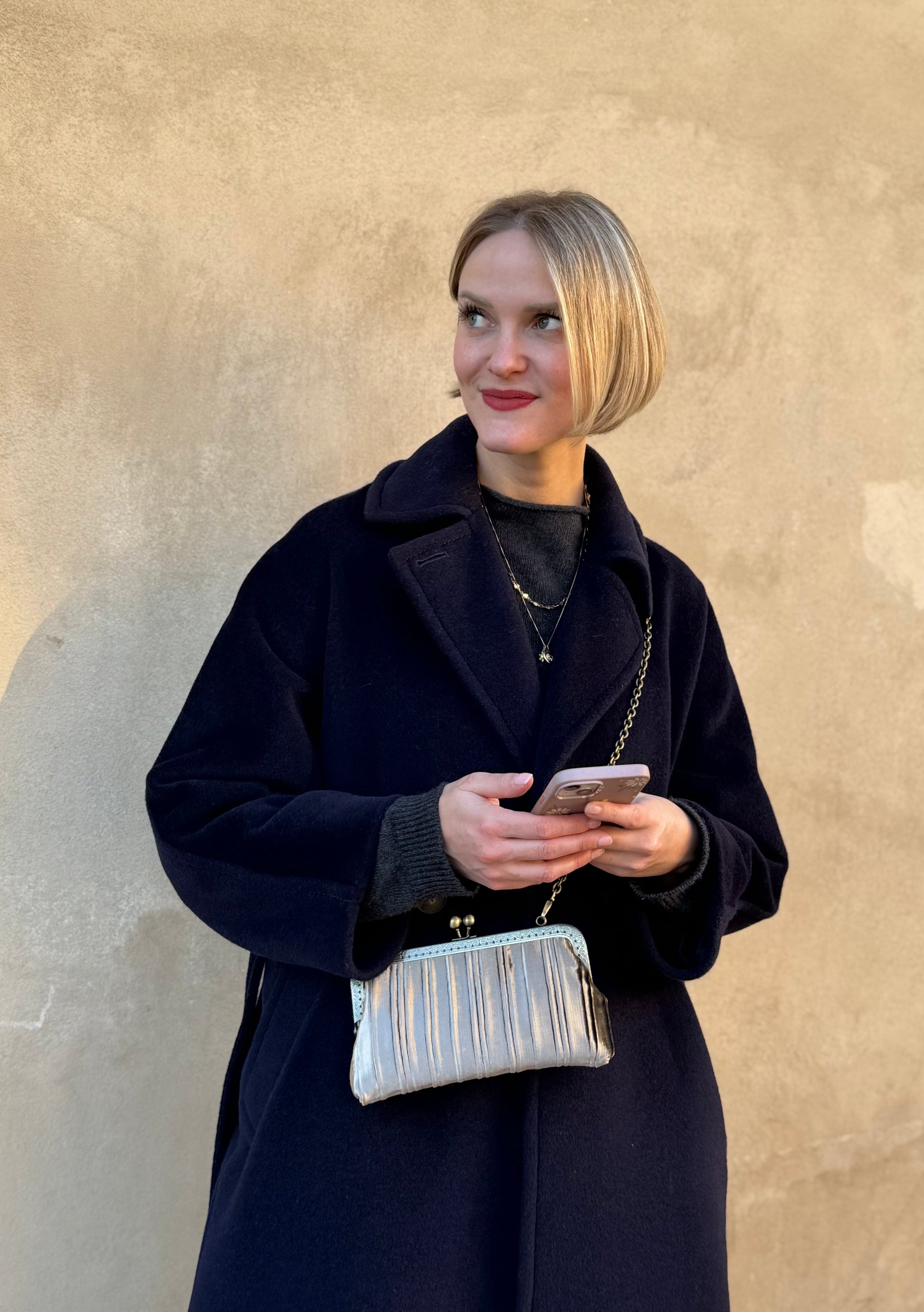 Luna Cross Sipario Beige– Mini borsa artigianale realizzata in pregiato velluto d'arredo con interni in raso, pensata per custodire il cellulare con stile. Un portacellulare elegante e unico, con tracolla in metallo e chiusura clic clac.