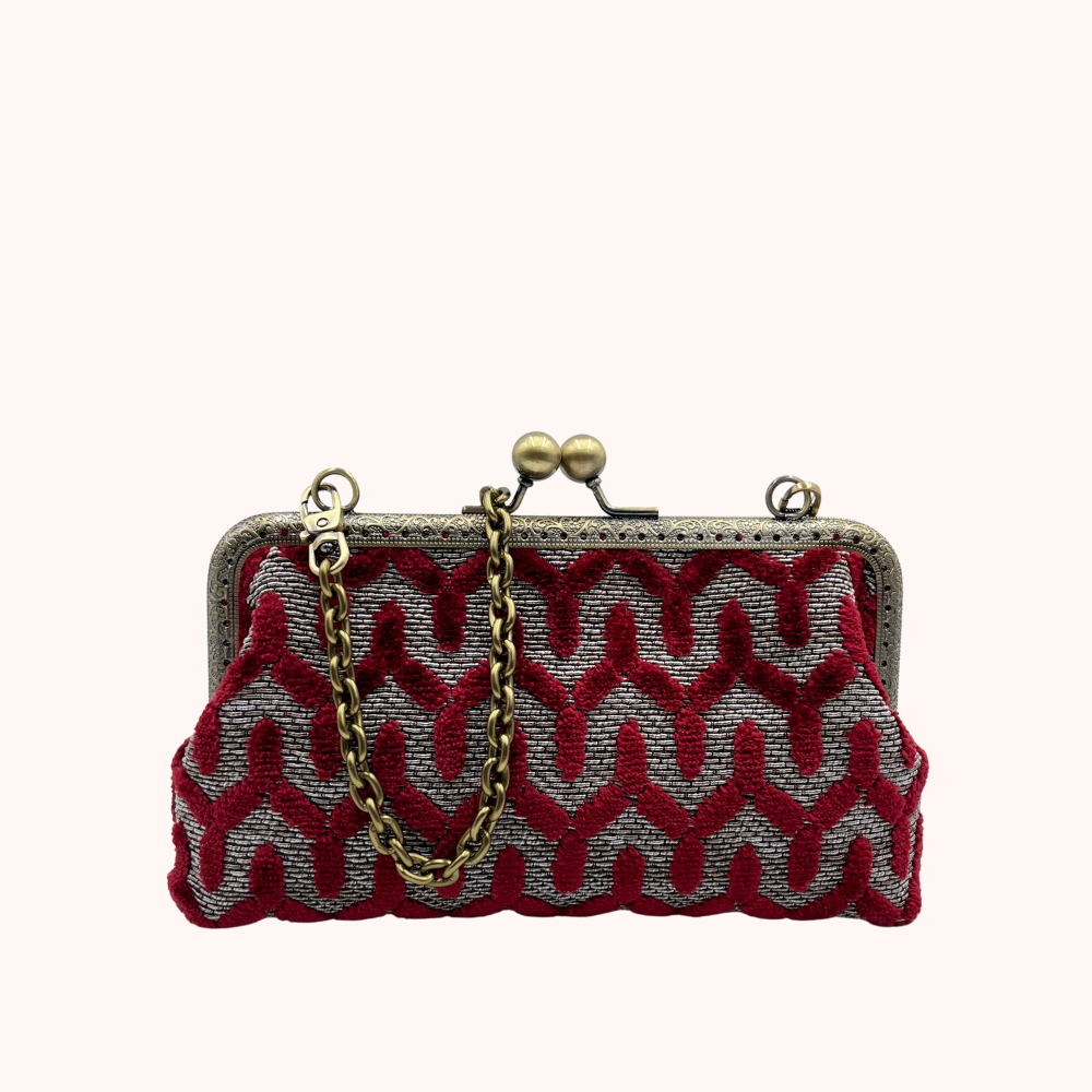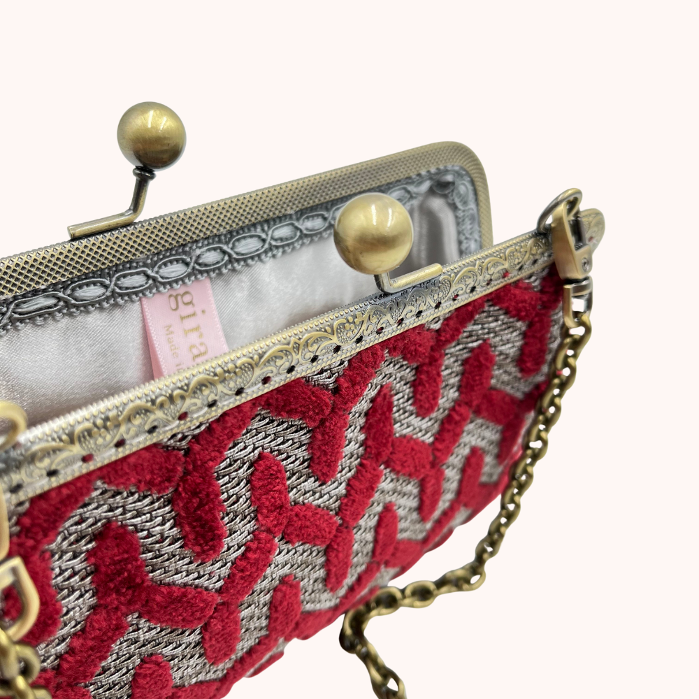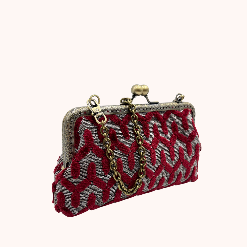 Luna Cross Volcano – Mini borsa artigianale realizzata in pregiato velluto d'arredo con interni in raso, pensata per custodire il cellulare con stile. Un portacellulare elegante e unico, con tracolla in metallo e chiusura clic clac.