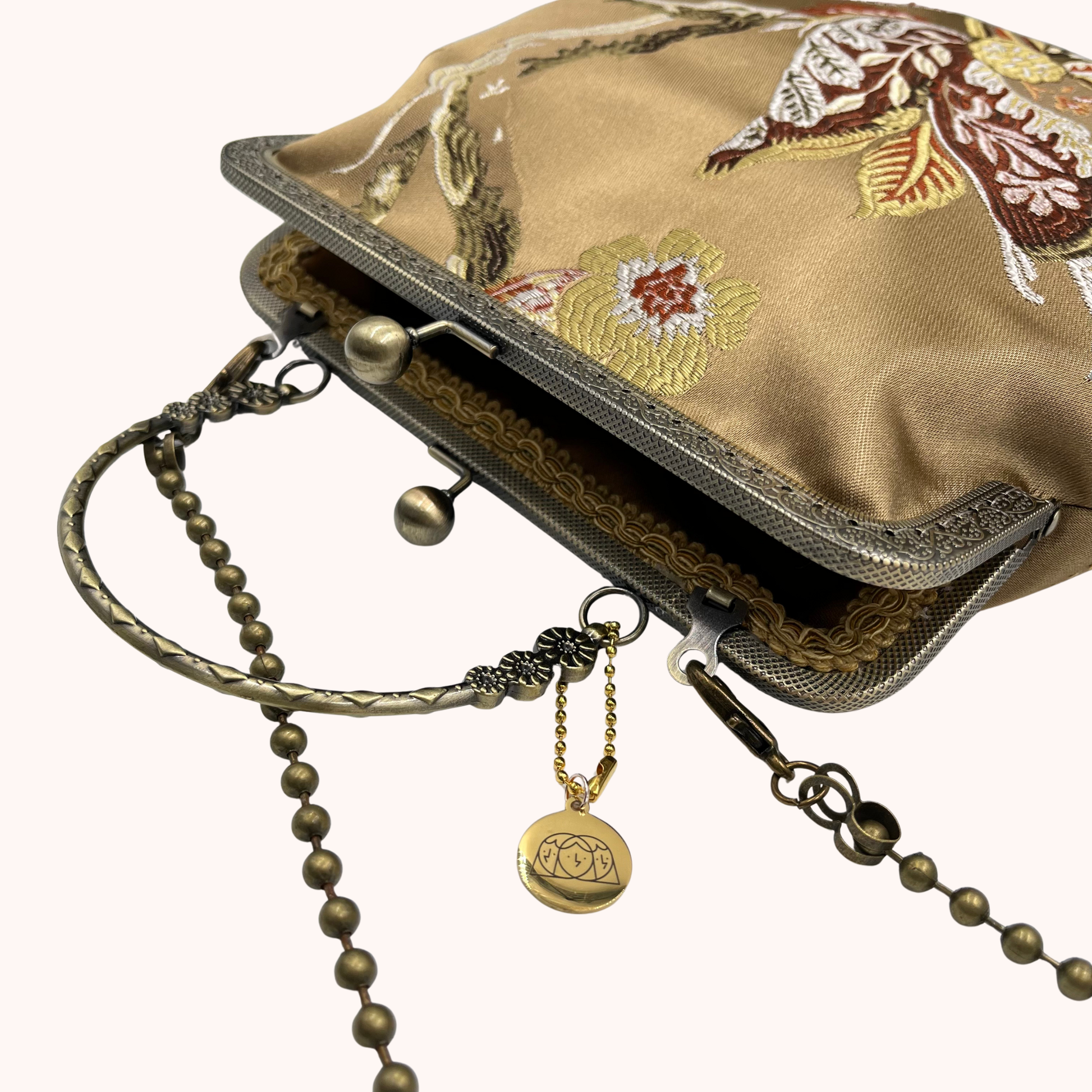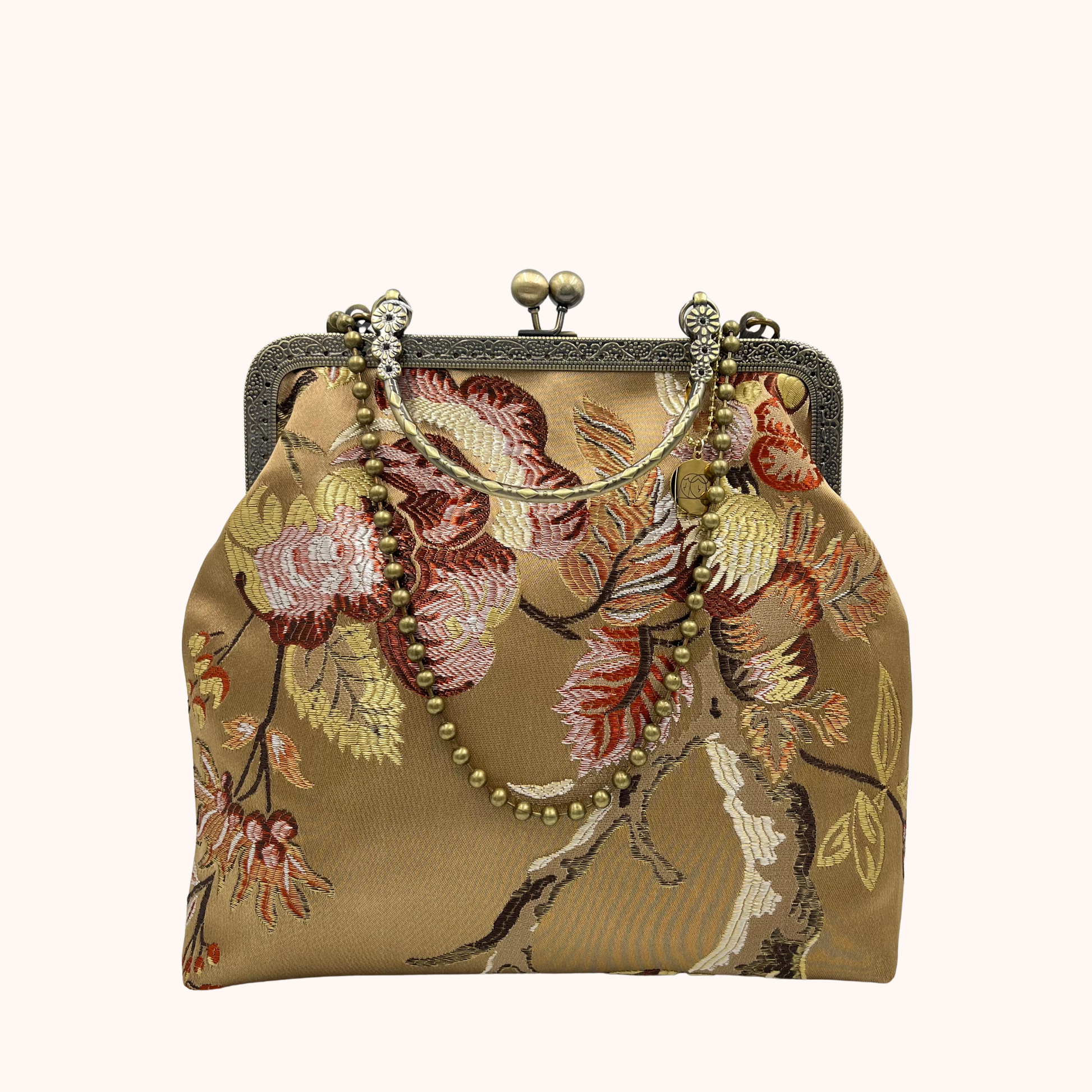 La nostra Margot Chateau Gold è realizzata in tessuto damascato, ha una chiusura colore bronzo di 20cm e una catena rimovibile di 60cm. Al suo interno è foderata in raso.