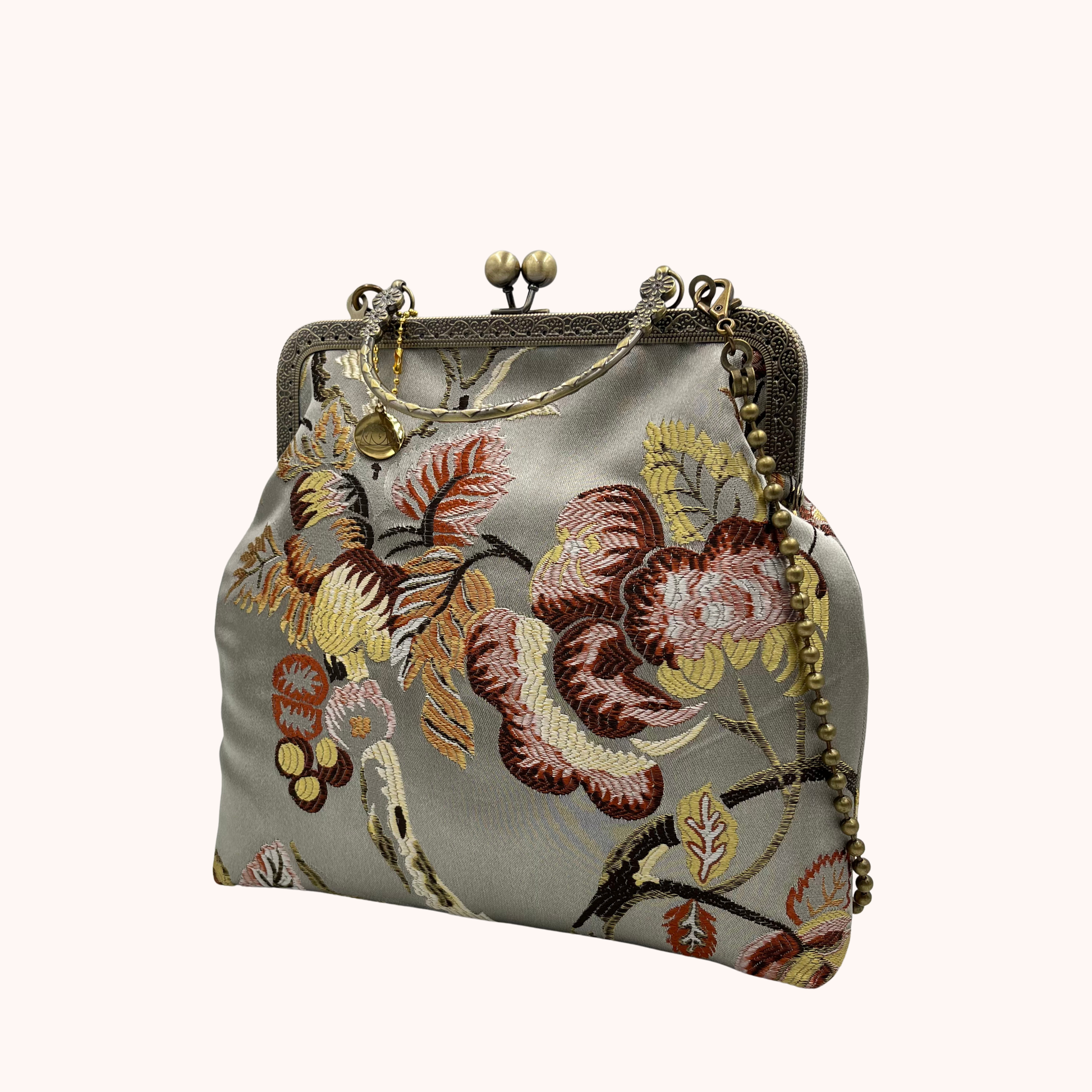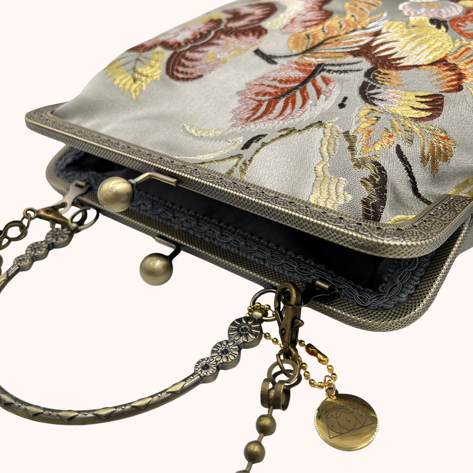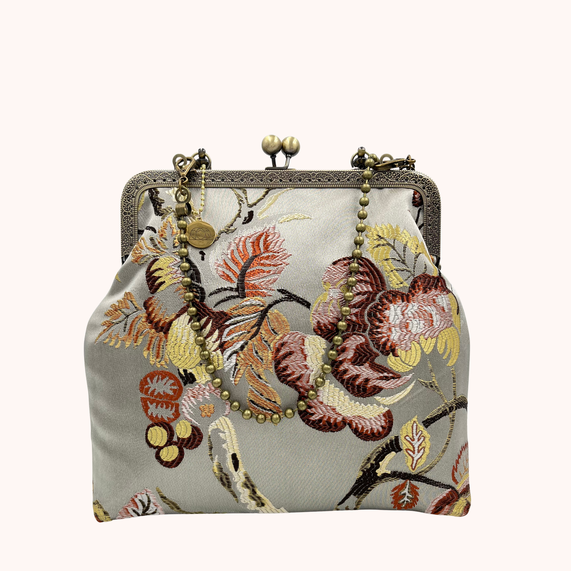 La nostra Margot Chateau Silver è realizzata in tessuto damascato, ha una chiusura colore bronzo di 20cm e una catena rimovibile di 60cm. Al suo interno è foderata in raso.