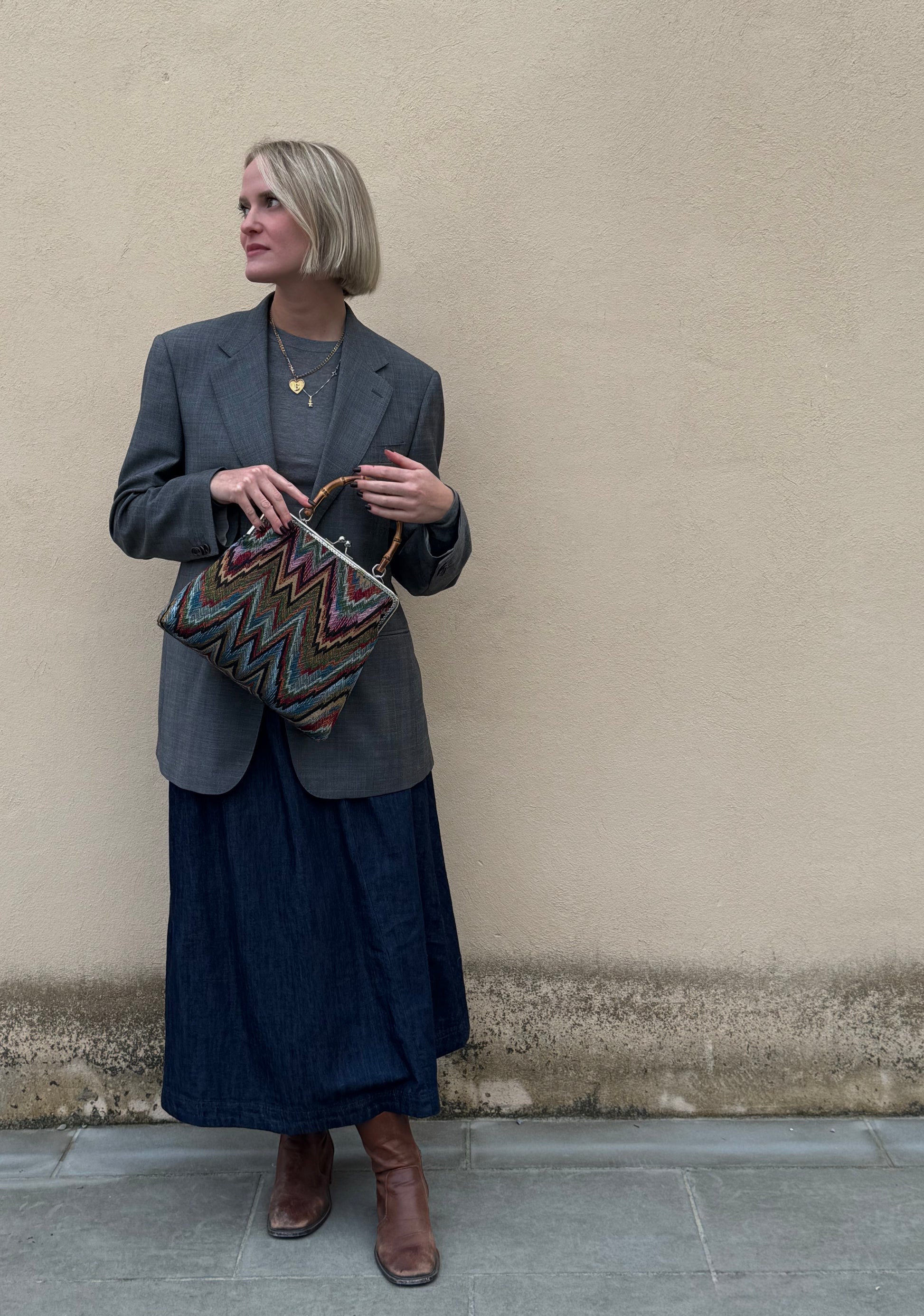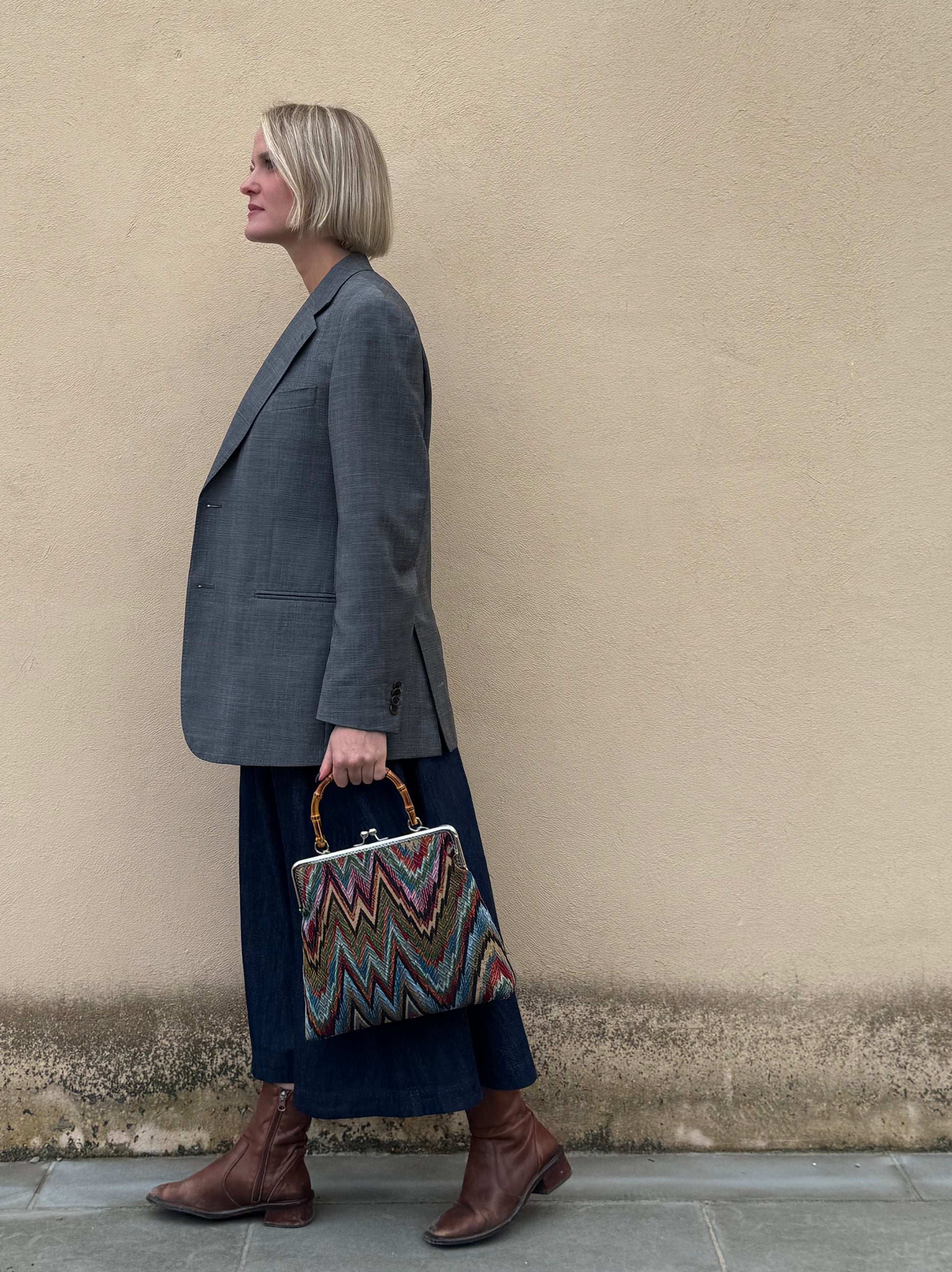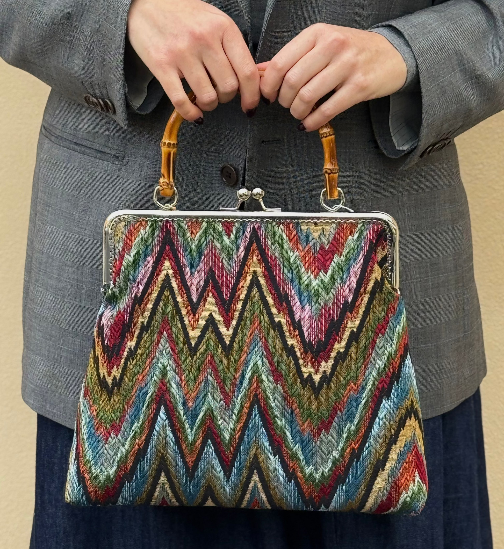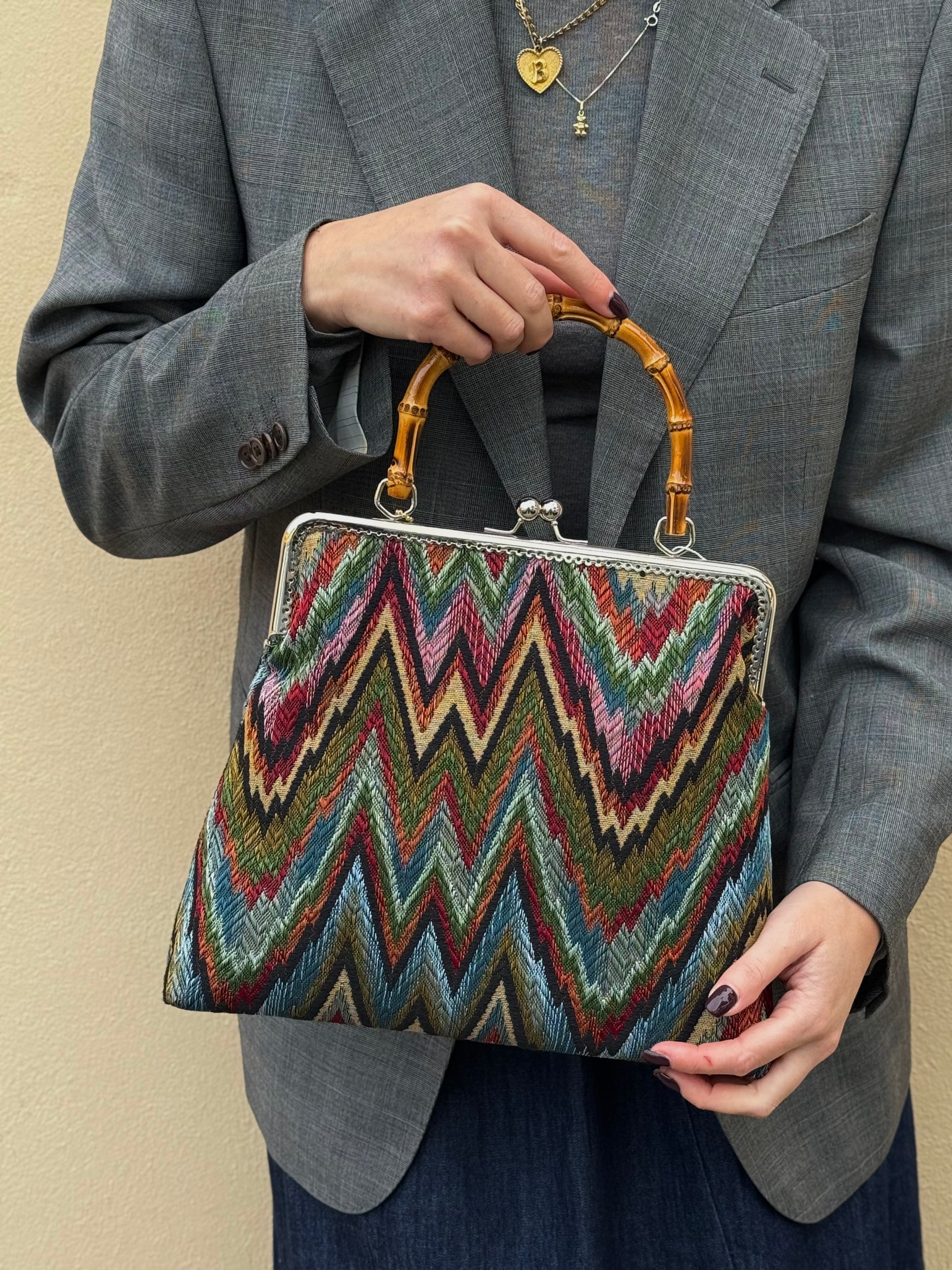 La nostra Lucrezia Ottavia bambù è realizzata in gobelin e ha una chiusura colore argento di 25cm con il manico in bambù. Al suo interno è foderata in raso e presenta una comoda tasca, anch'essa in raso.